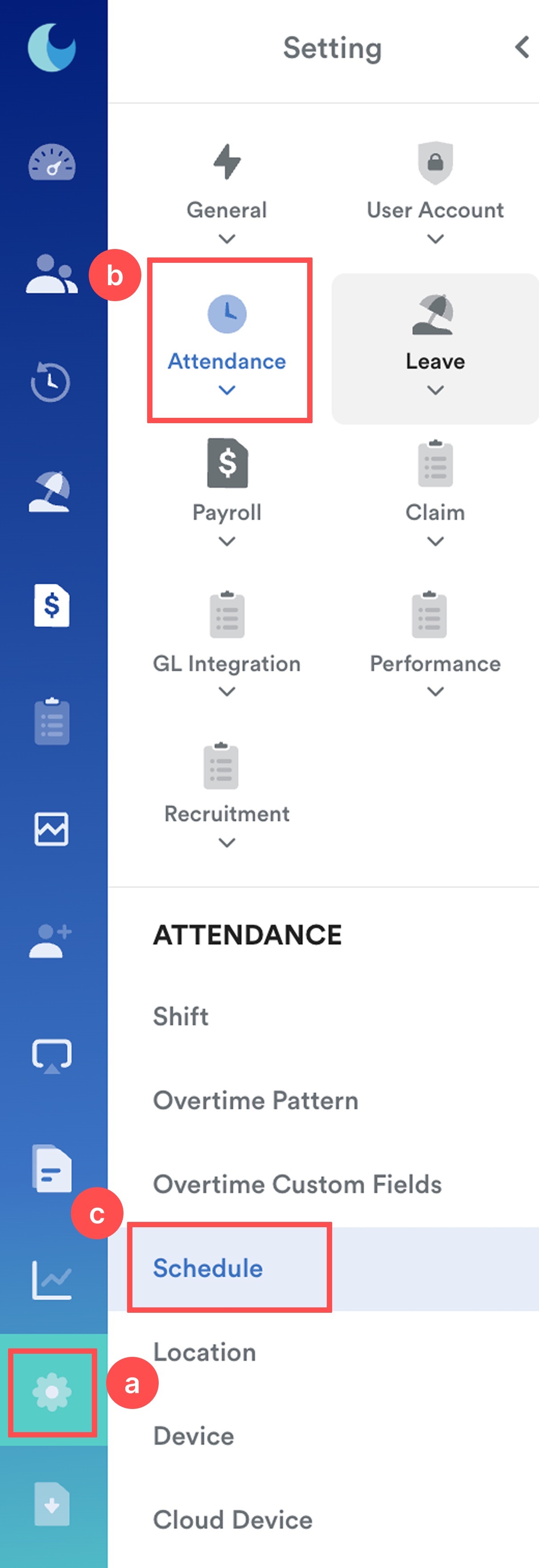 Go to Setting (a) > Attendance (b) > Schedule (c). Then, select the schedule assigned to the employee.