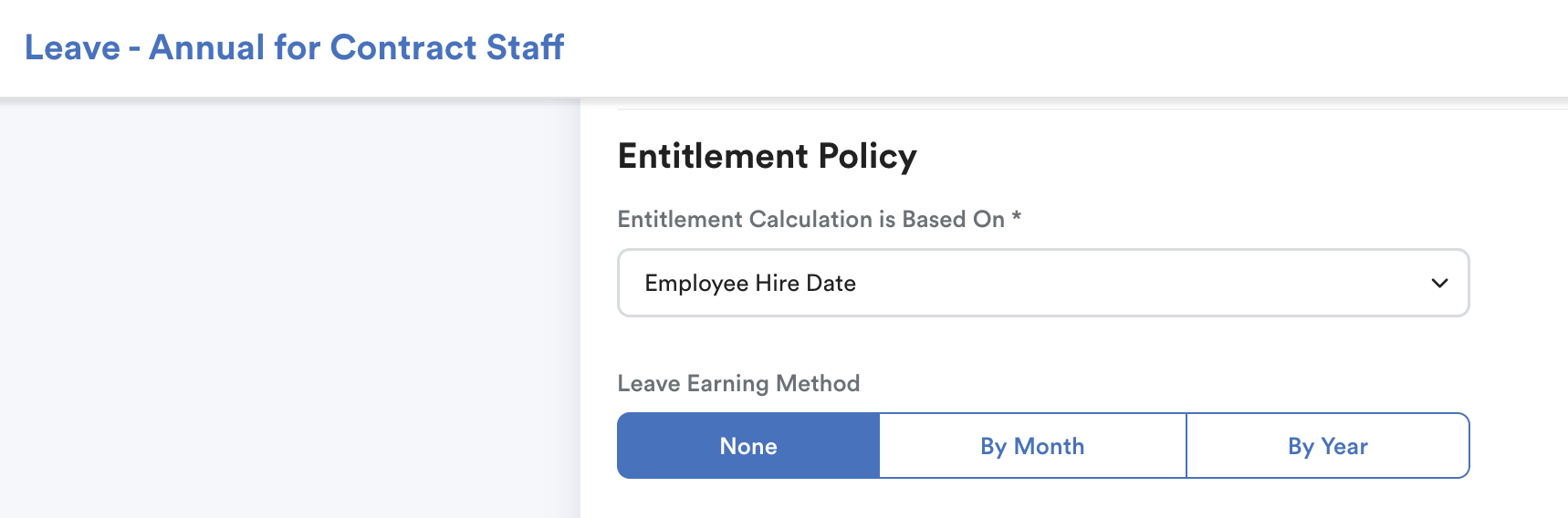 When setting up a Leave Type, you’ll come across the Entitlement Policy section. This includes two important settings: