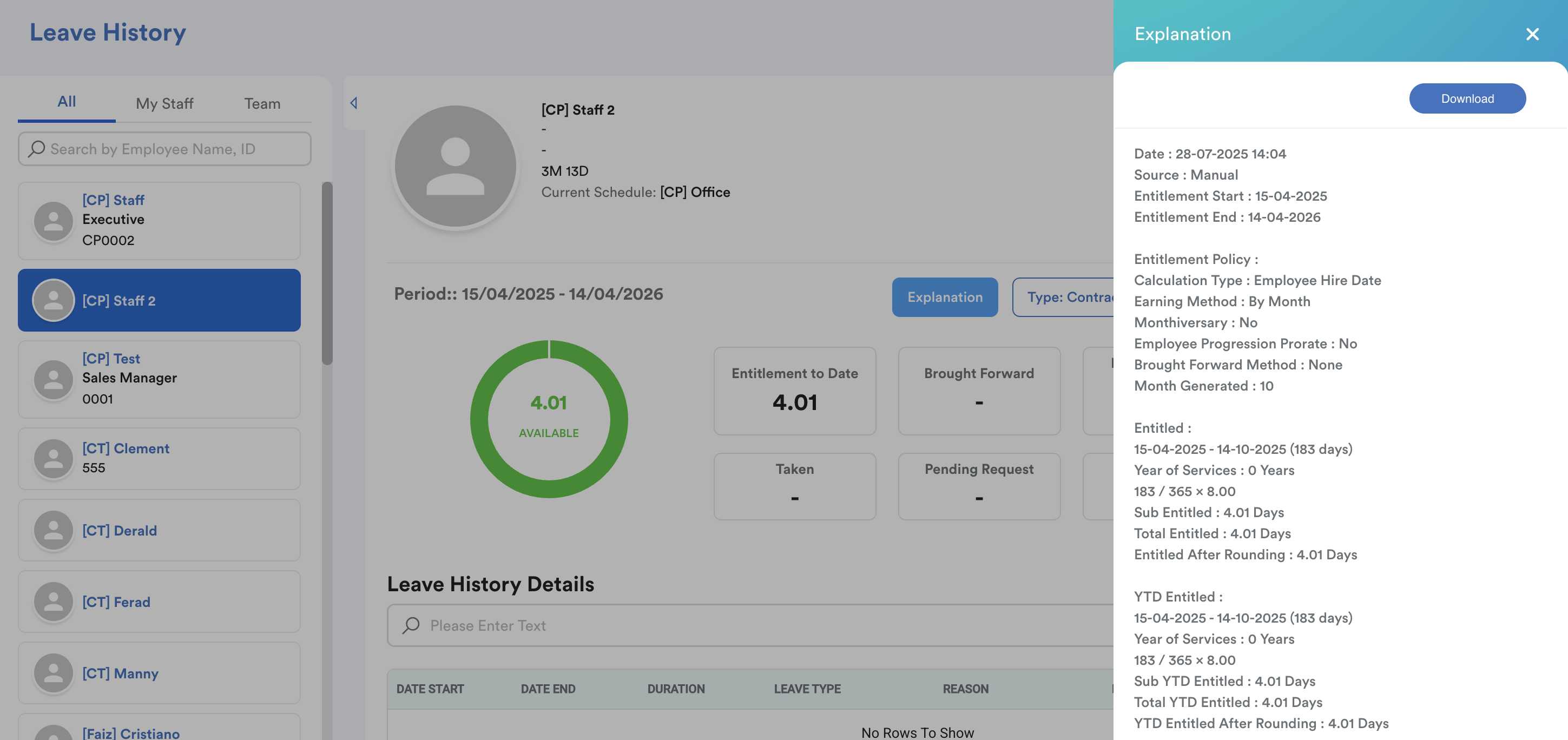 - Entitlement Calculation: Calculates the number of leave days an employee is entitled to.