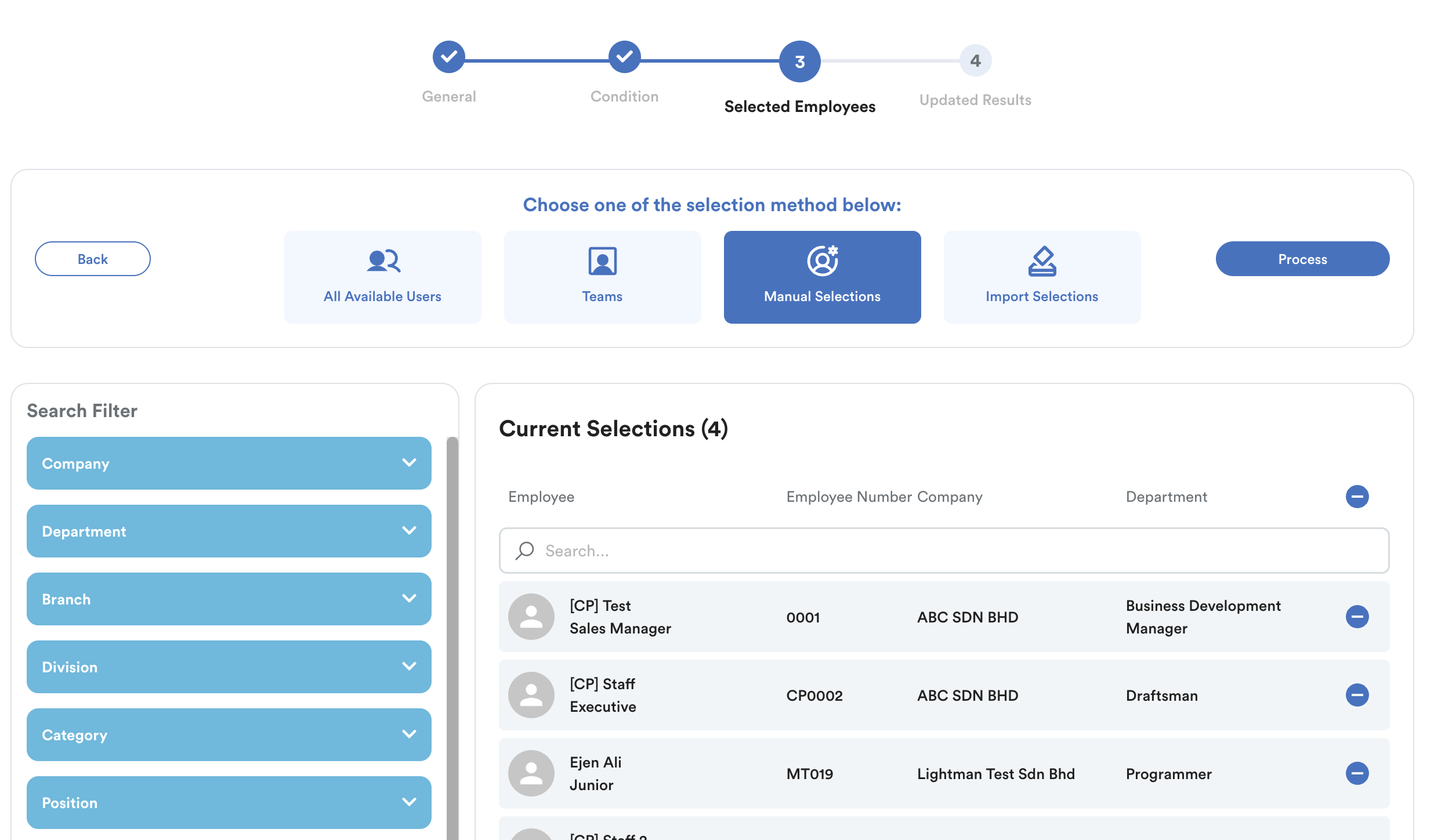 - You can make ad-hoc changes in "Your Selection" (a) tab to exclude specific employees.