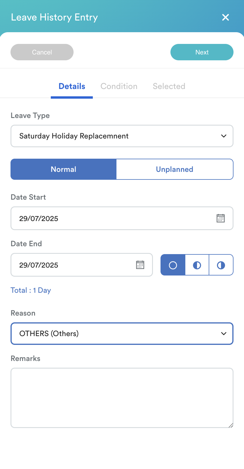 Start by selecting the Leave Type you want to adjust. Choose whether this should be marked as a Normal or Unplanned leave record.