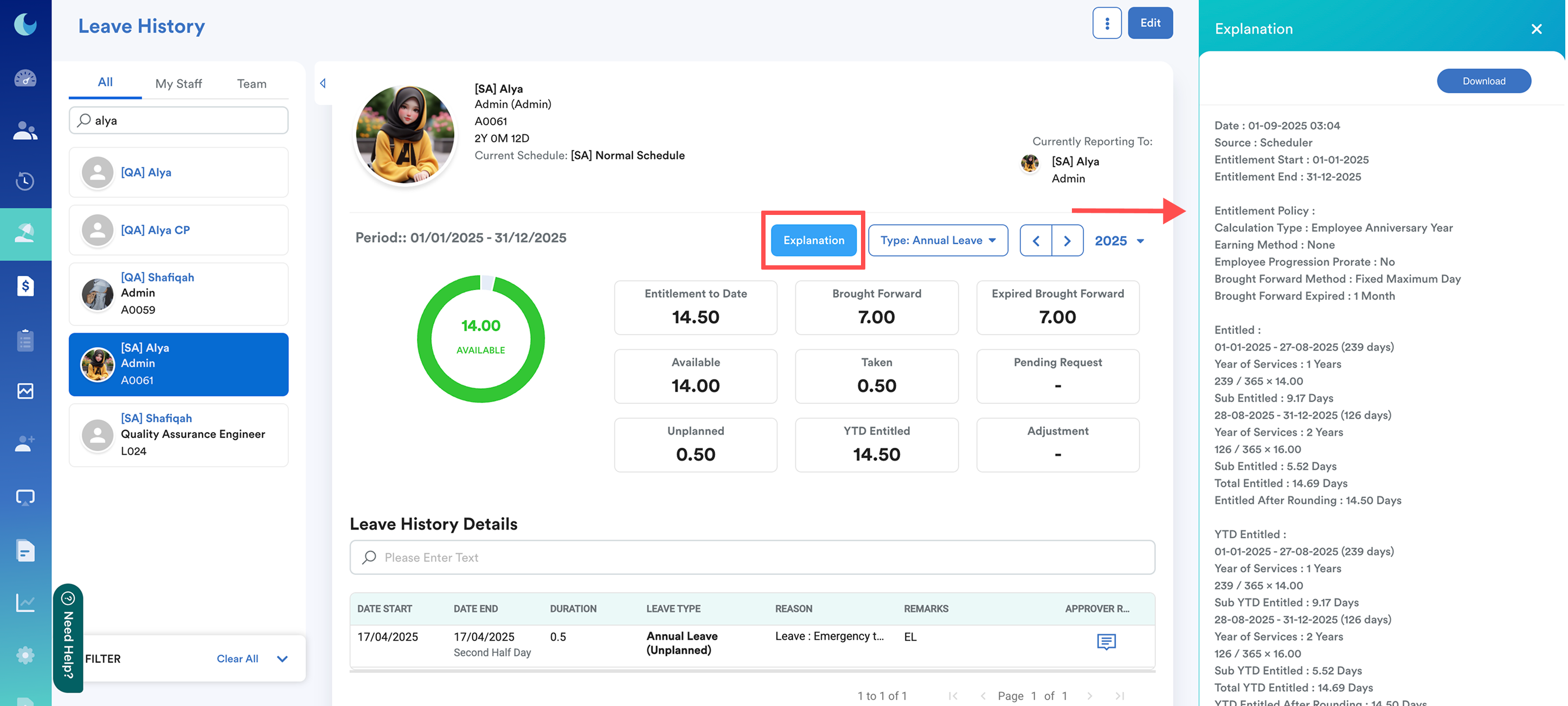 The Explanation button helps you with providing a detailed breakdown of how your leave entitlement is calculated. All of the information and calculations follow the policy set in your Leave Type settings.