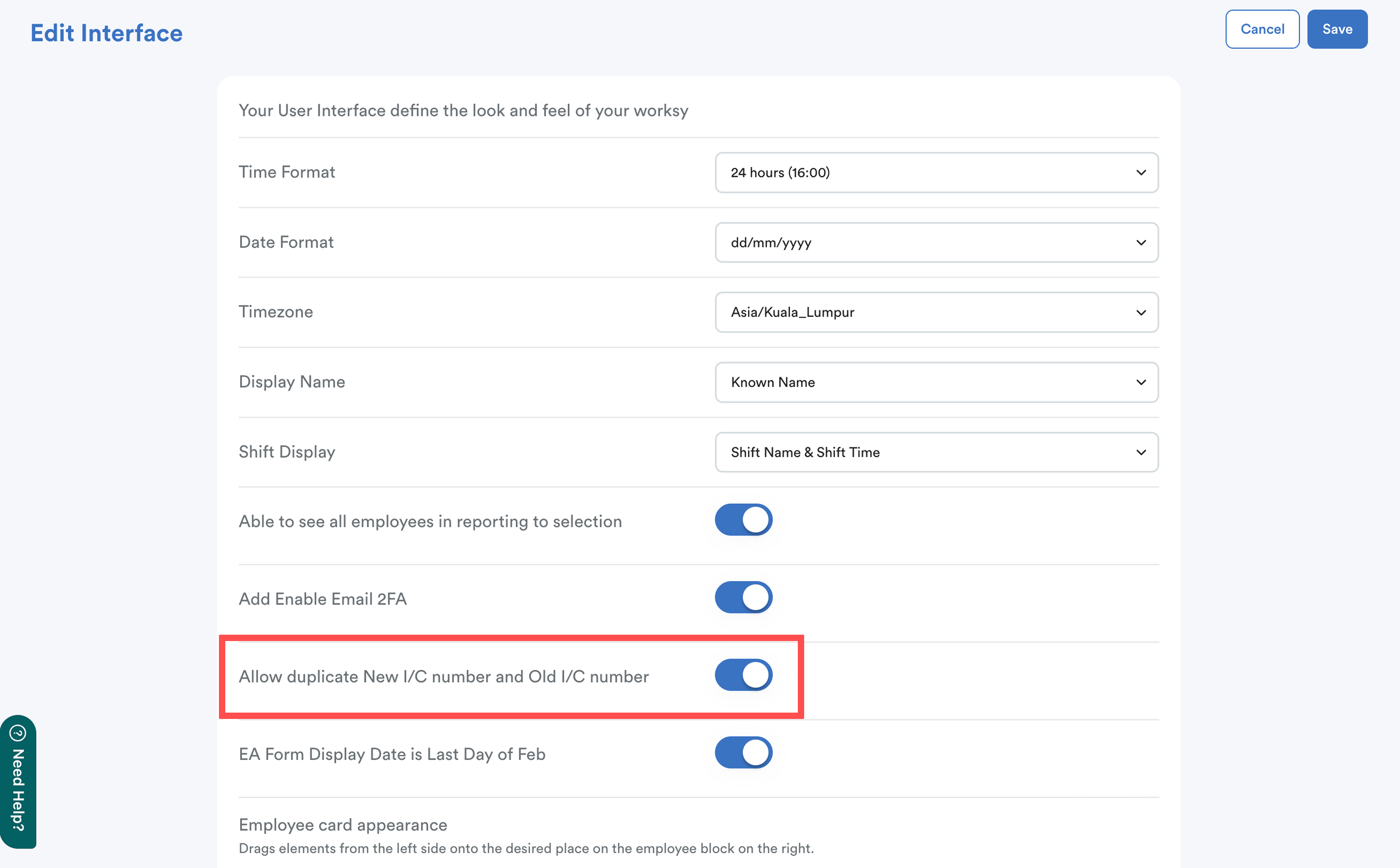 To support this, Worksy provides an option to allow duplicate I/C numbers which lets HR create another user account for the same employee under a different company.