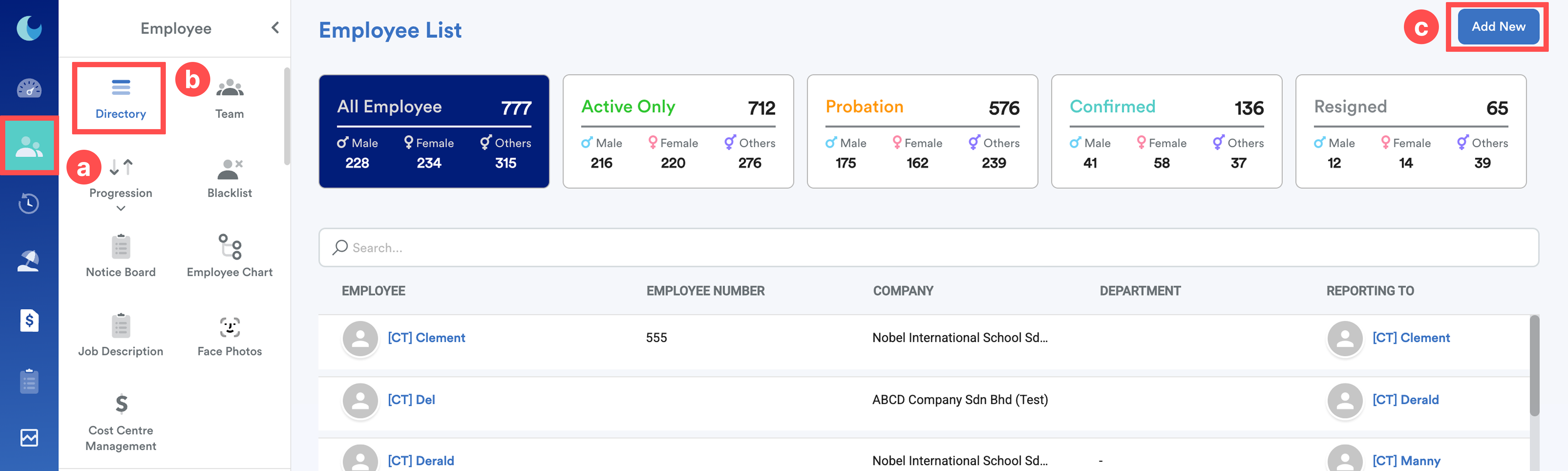 On the left menu, go to Employee (a) > Directory (b) > Add New (c).