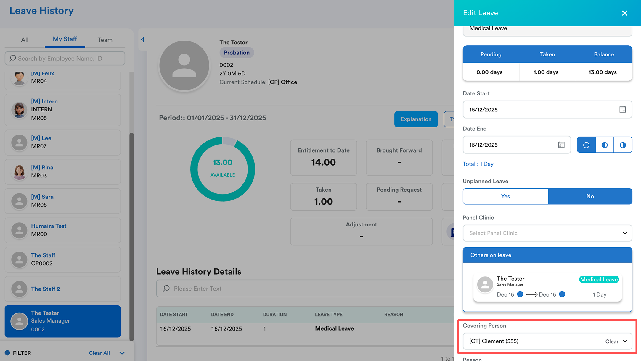 For approved leave, the admin can change or remove the covering person in the leave history.