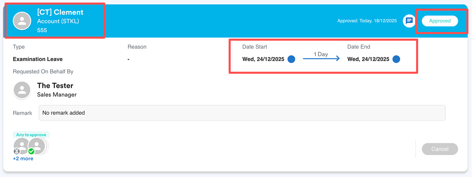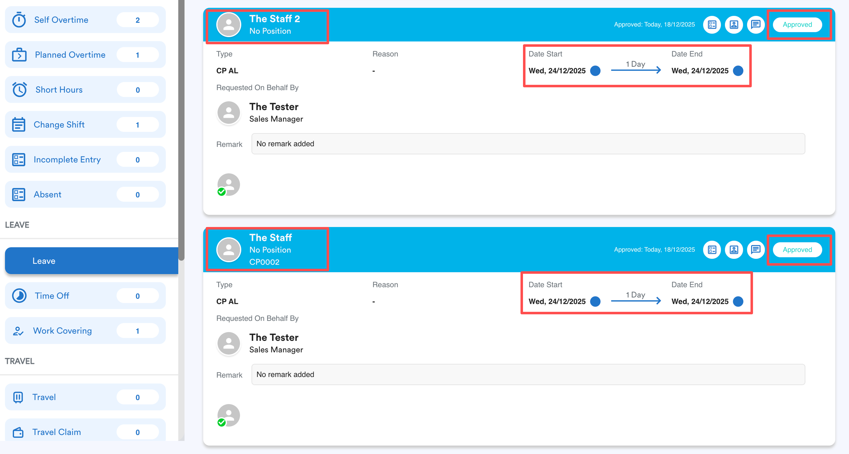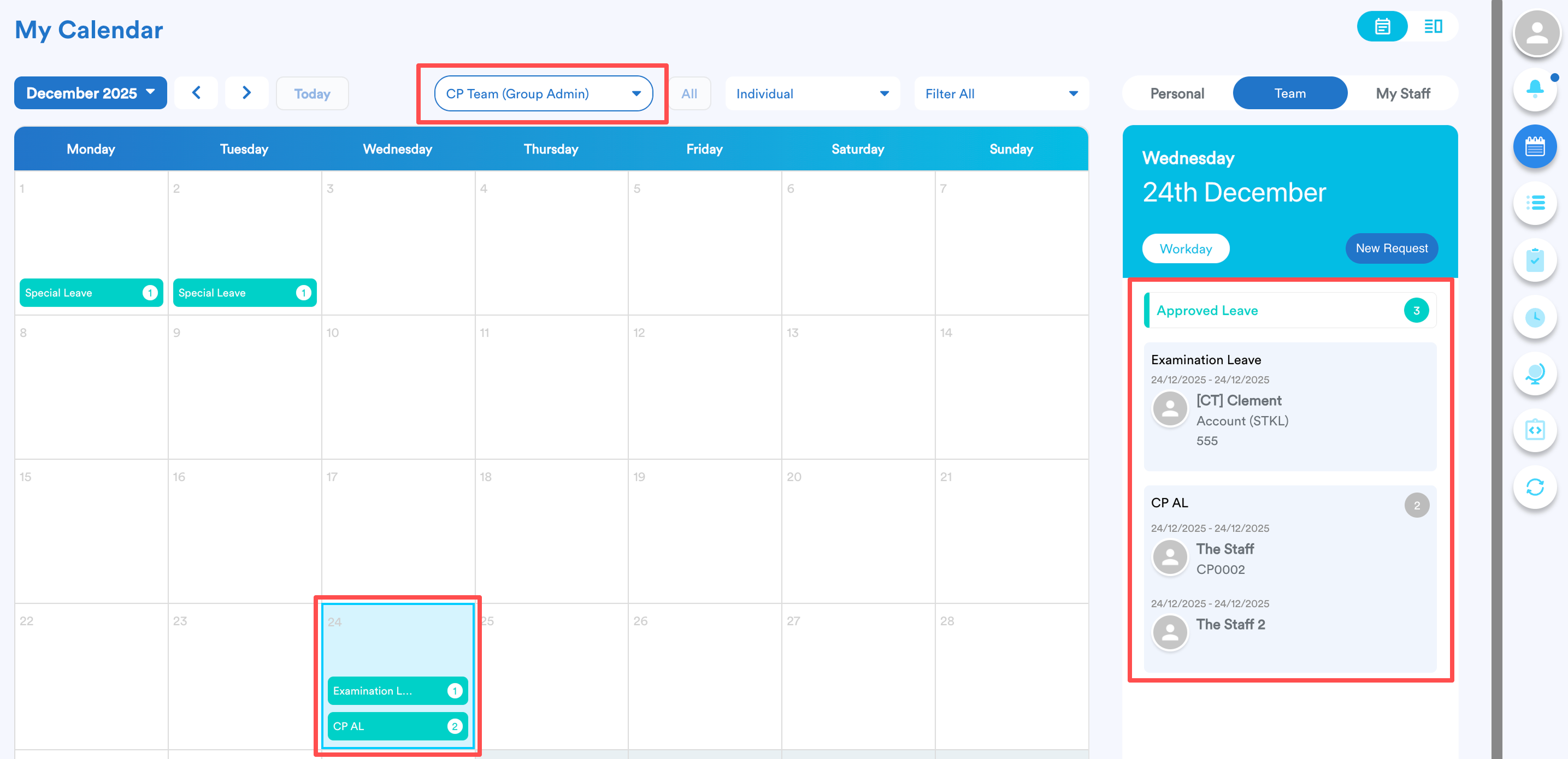 Leave(s) on 24 Dec 2025 are approved for The Staff 2, The Staff and [CT] Clement.