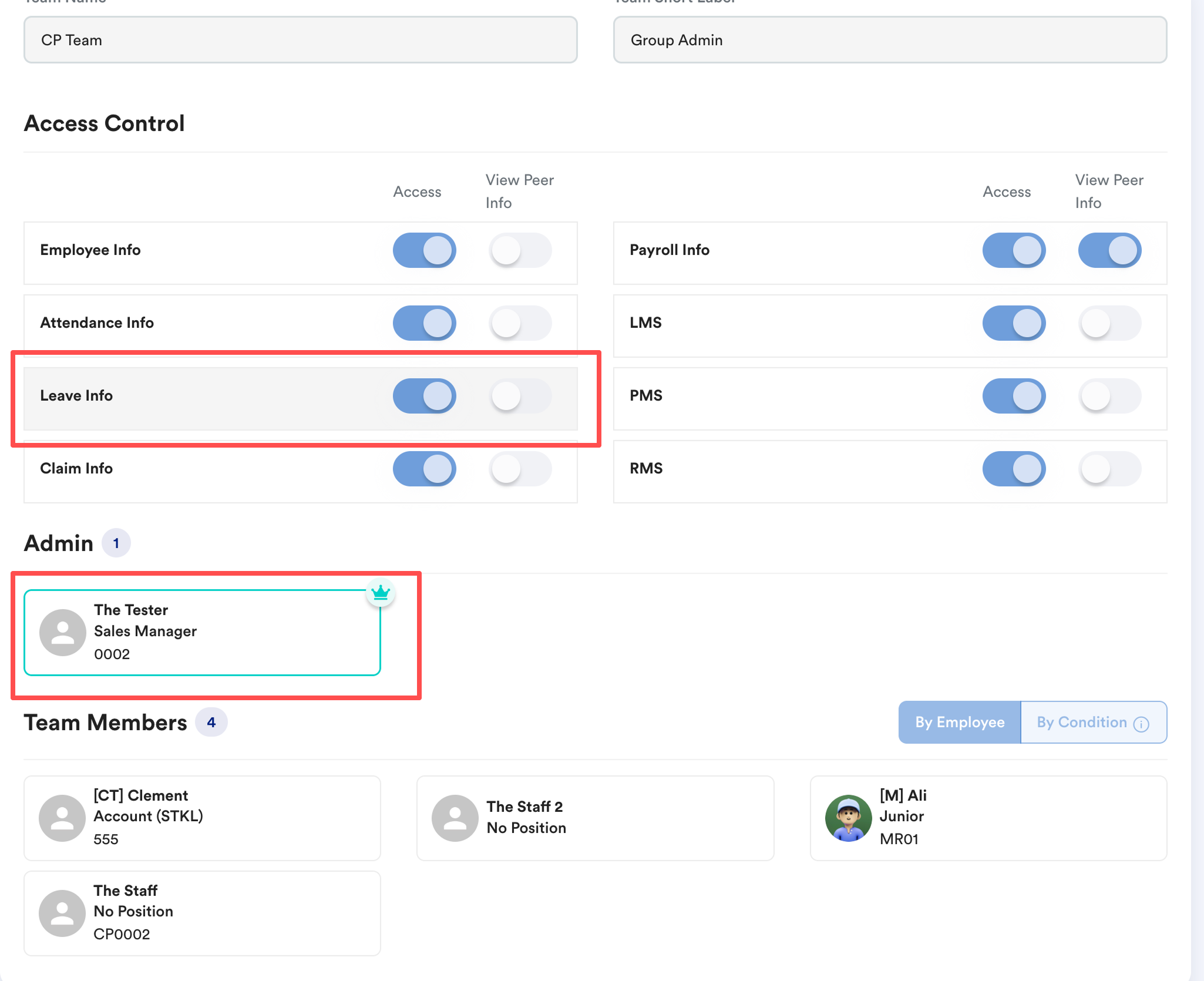 I set "CP Team" with "The Tester" as an admin. I have 4 team members, with the access turned on for Leave Info.
