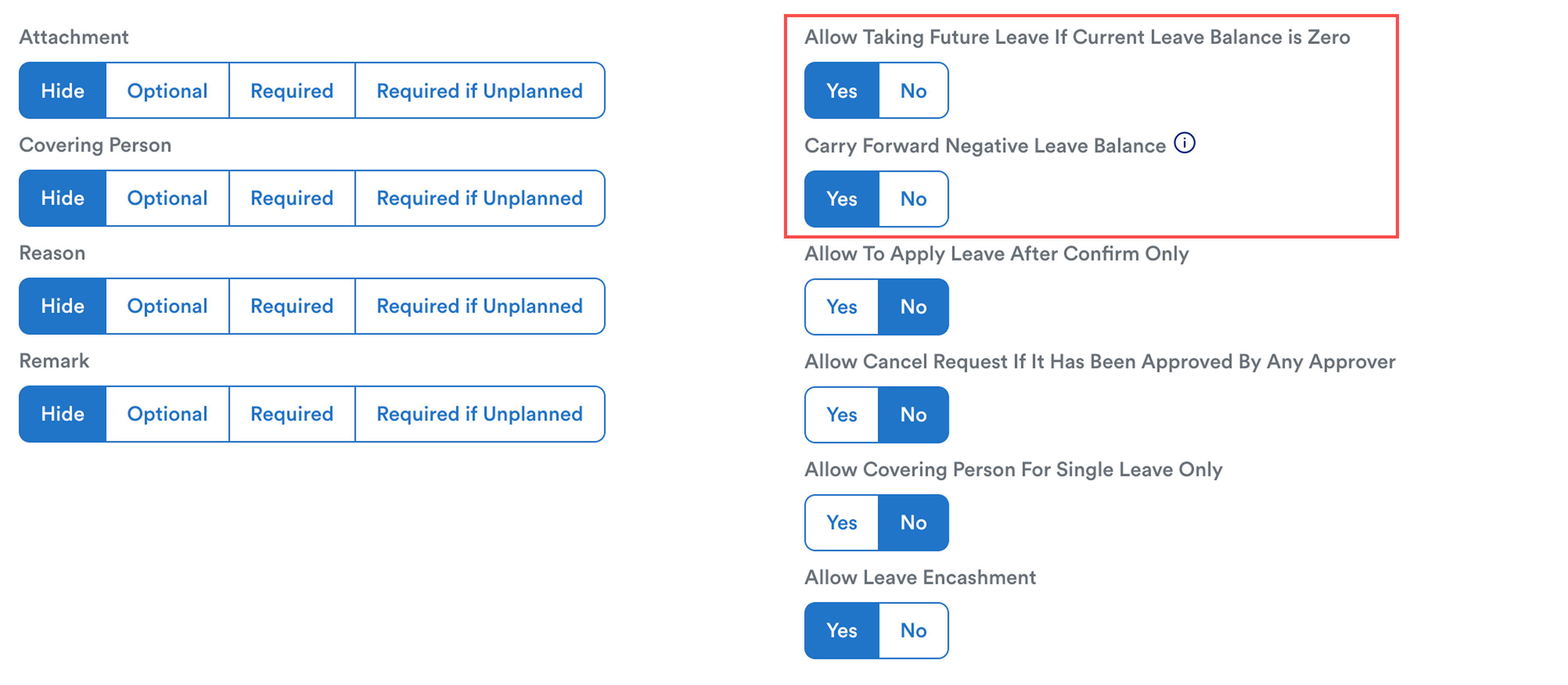 You also need to turn on "Allow Taking Future Leave If Current Leave Balance is Zero", so employees can still apply for leave when the leave balance is zero.