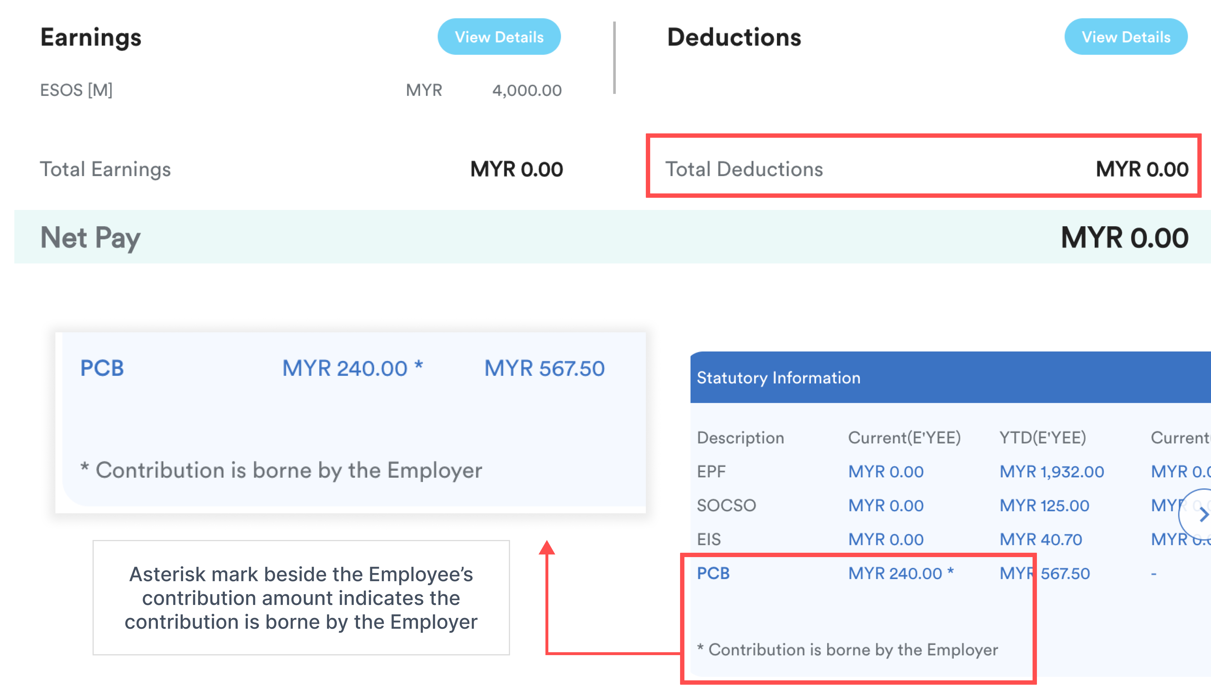 In Payroll Review, the Deductions section should be blank as all government statutory were disabled for ESOS and PCB is borne by the employer.