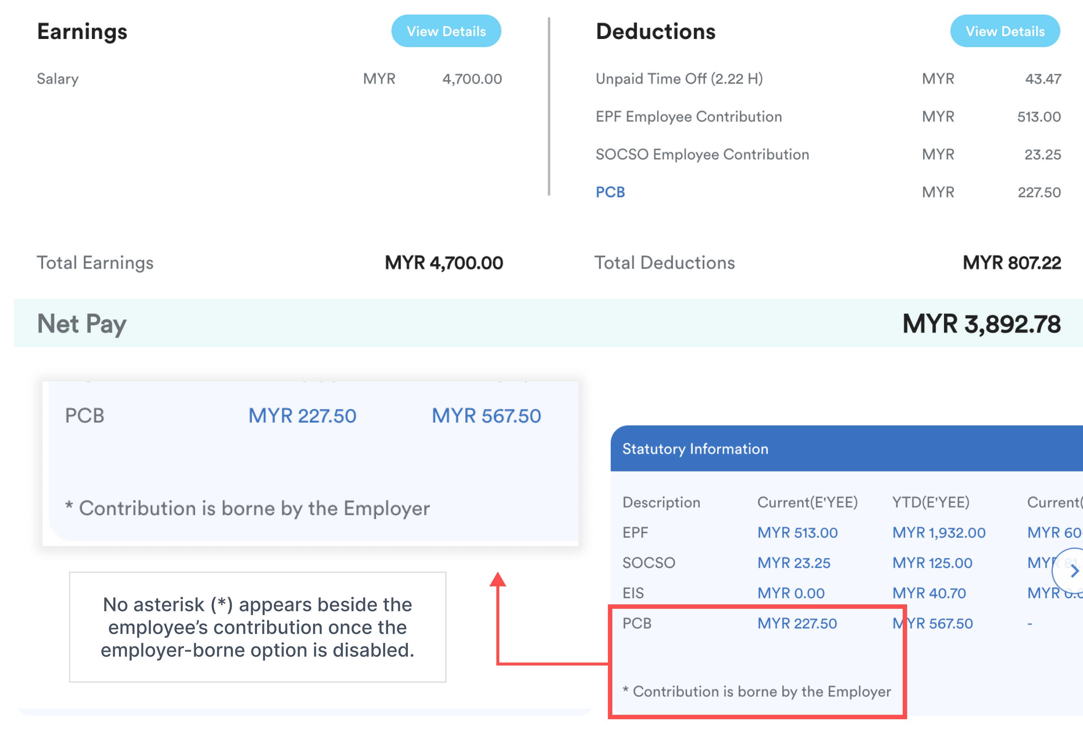 The employee’s statutory contribution should no longer have an asterisk (*) since the “Employer Bears Tax Contribution” option has been disabled.