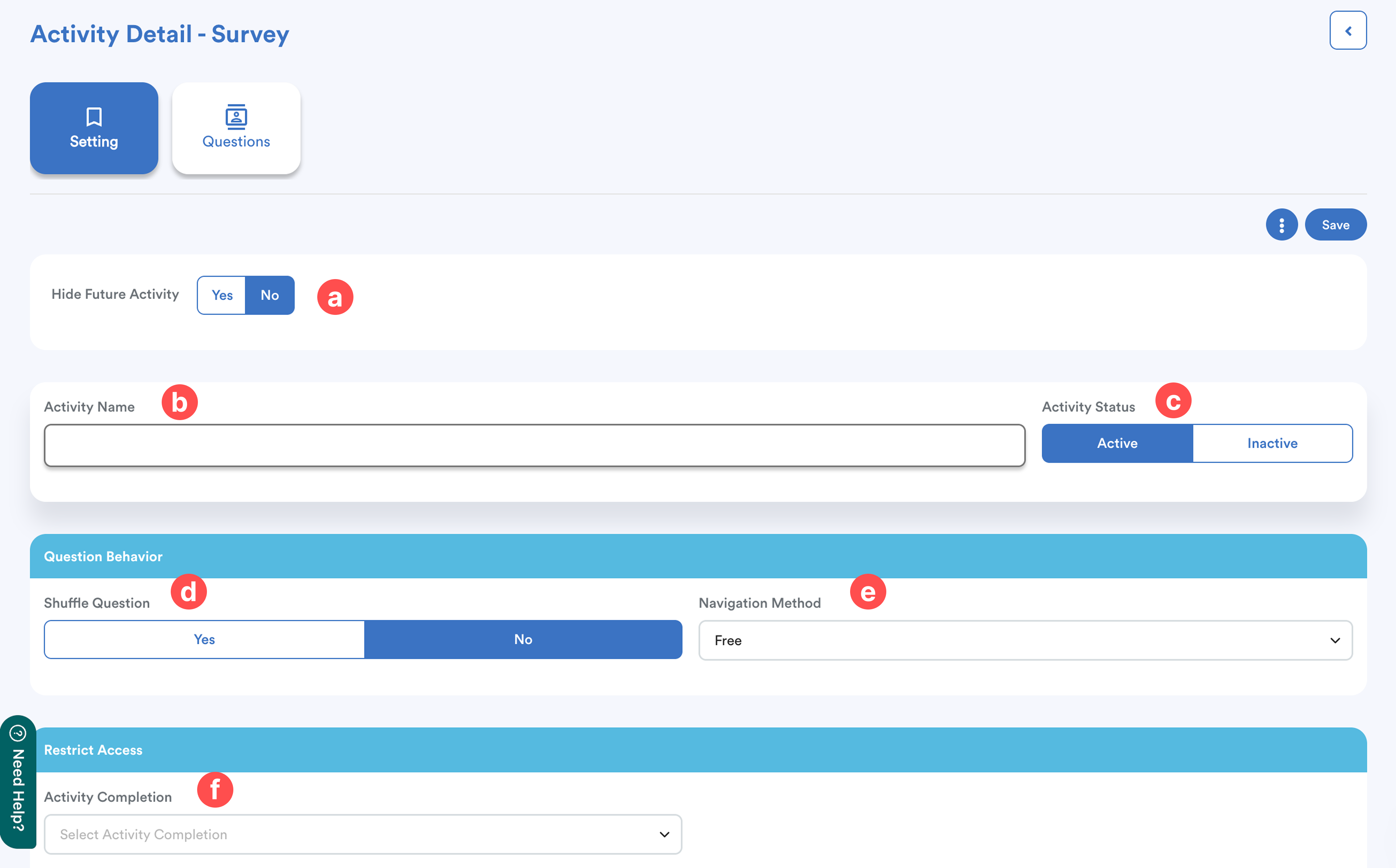 c. Activity Status - Set to Active or Inactive. Inactive surveys will not be visible or accessible to learners.