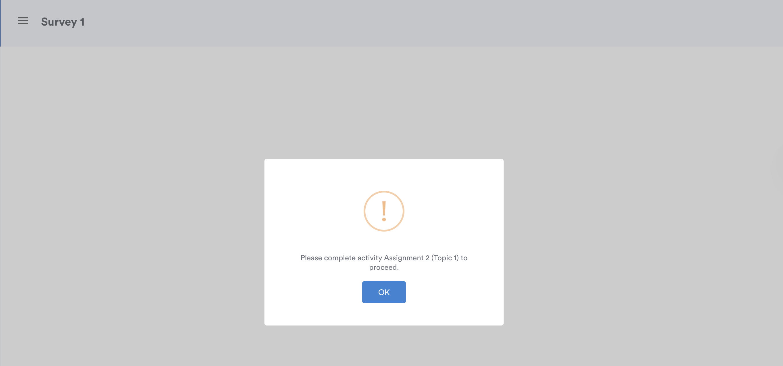 Let's say I set "Assignment 2" for my survey, this means I must complete "Assignment 2" prior to the survey. Otherwise, I will receive this error prompt.
