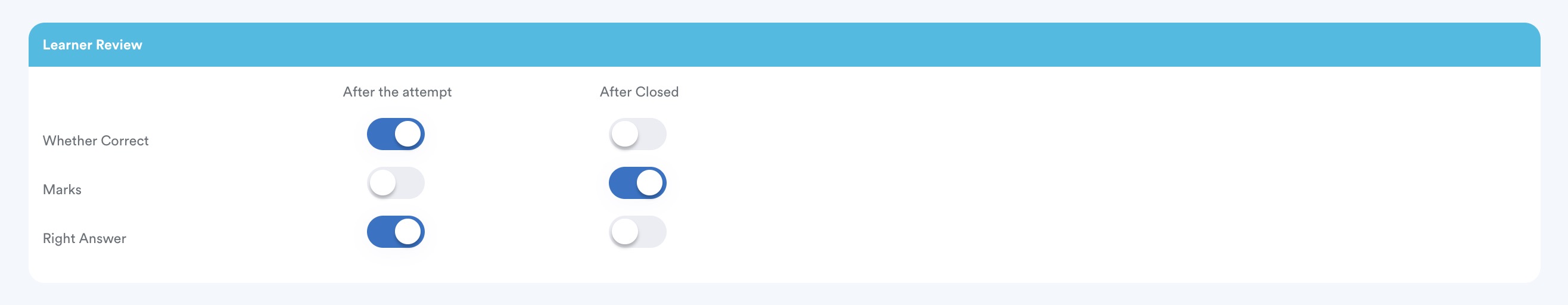 For each stage, After the Attempt or After Closed, choose whether learners can see: