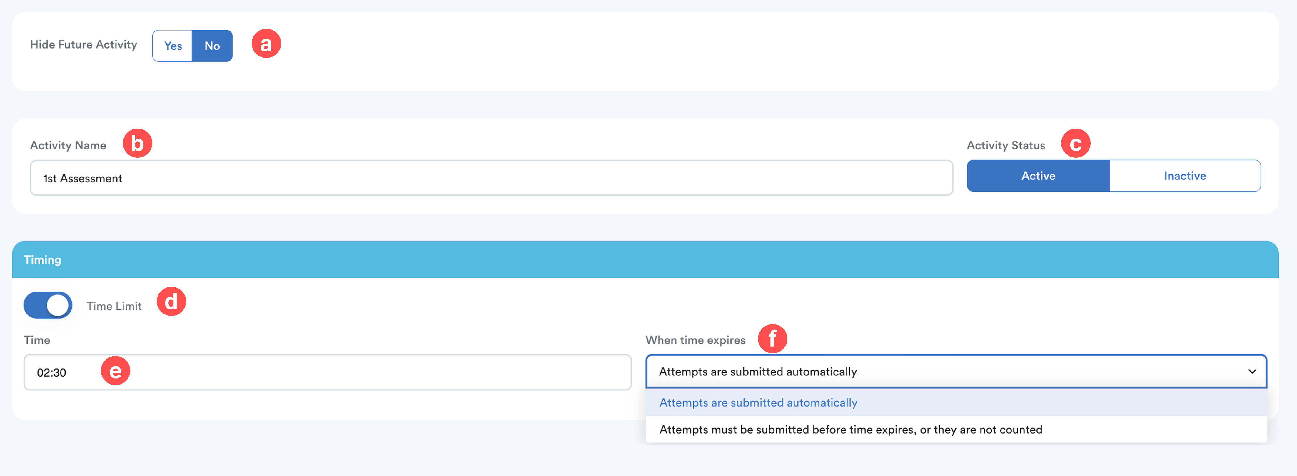 d. Time Limit - Toggle this on if you want to set a time restriction for the assessment.