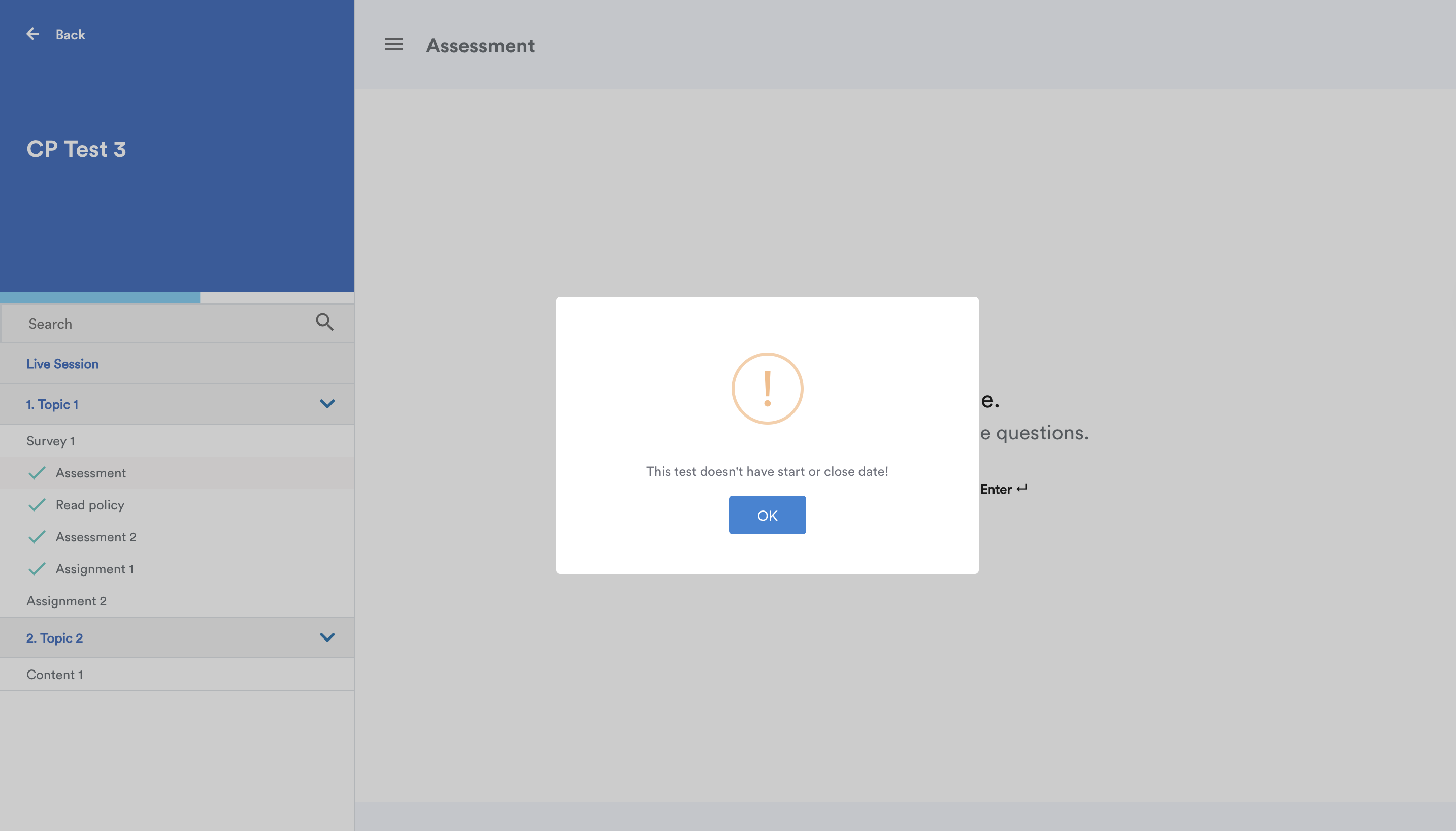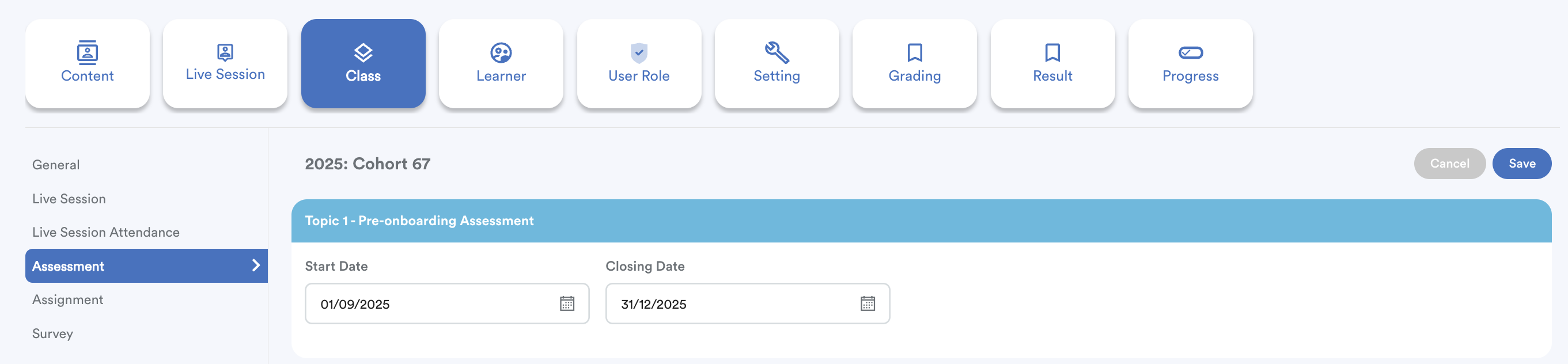 Important: Set the Start Date and Closing Date for when learners can access the assessment, then click Save. Without setting this will cause learners receive an error prompt.