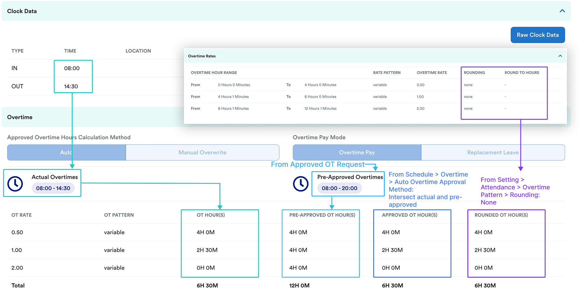 3.5 Approved OT Hour(s): Setting > Attendance > Schedule > Overtime > Auto Overtime Approval Method, refer to Auto Overtime Approval Methods