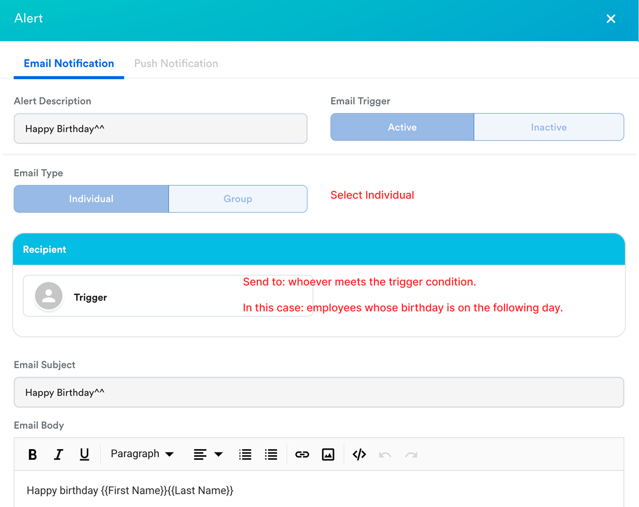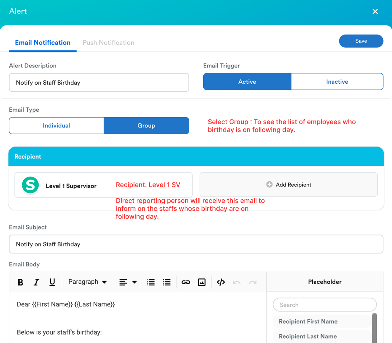 This article explains the setup for birthday email notifications for both birthday staff and direct supervisor/HR.