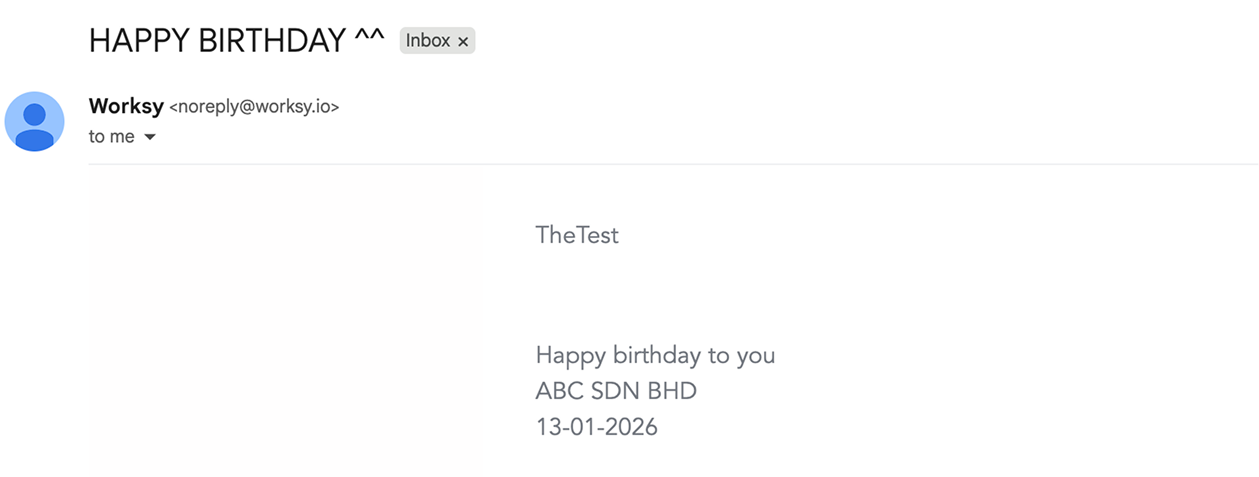 With the above settings, an email will be sent to “The Test”, who is the direct supervisor of staff with birthdays on 14 Jan 2026.