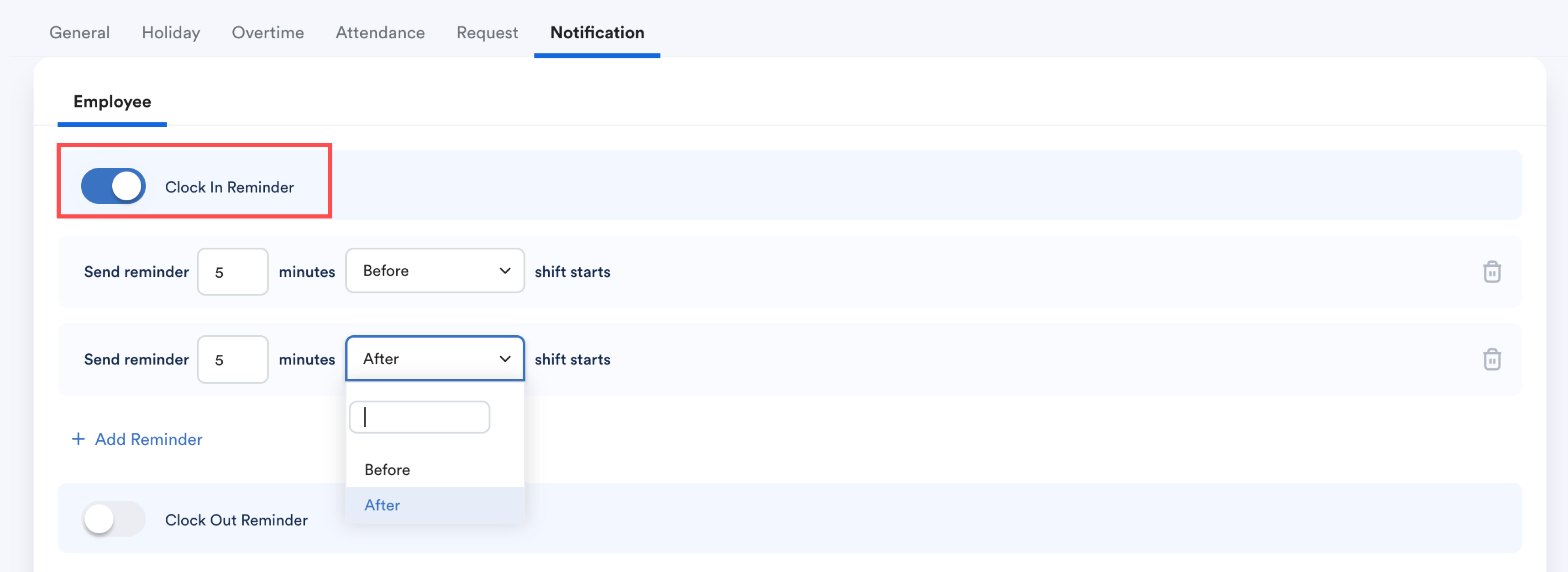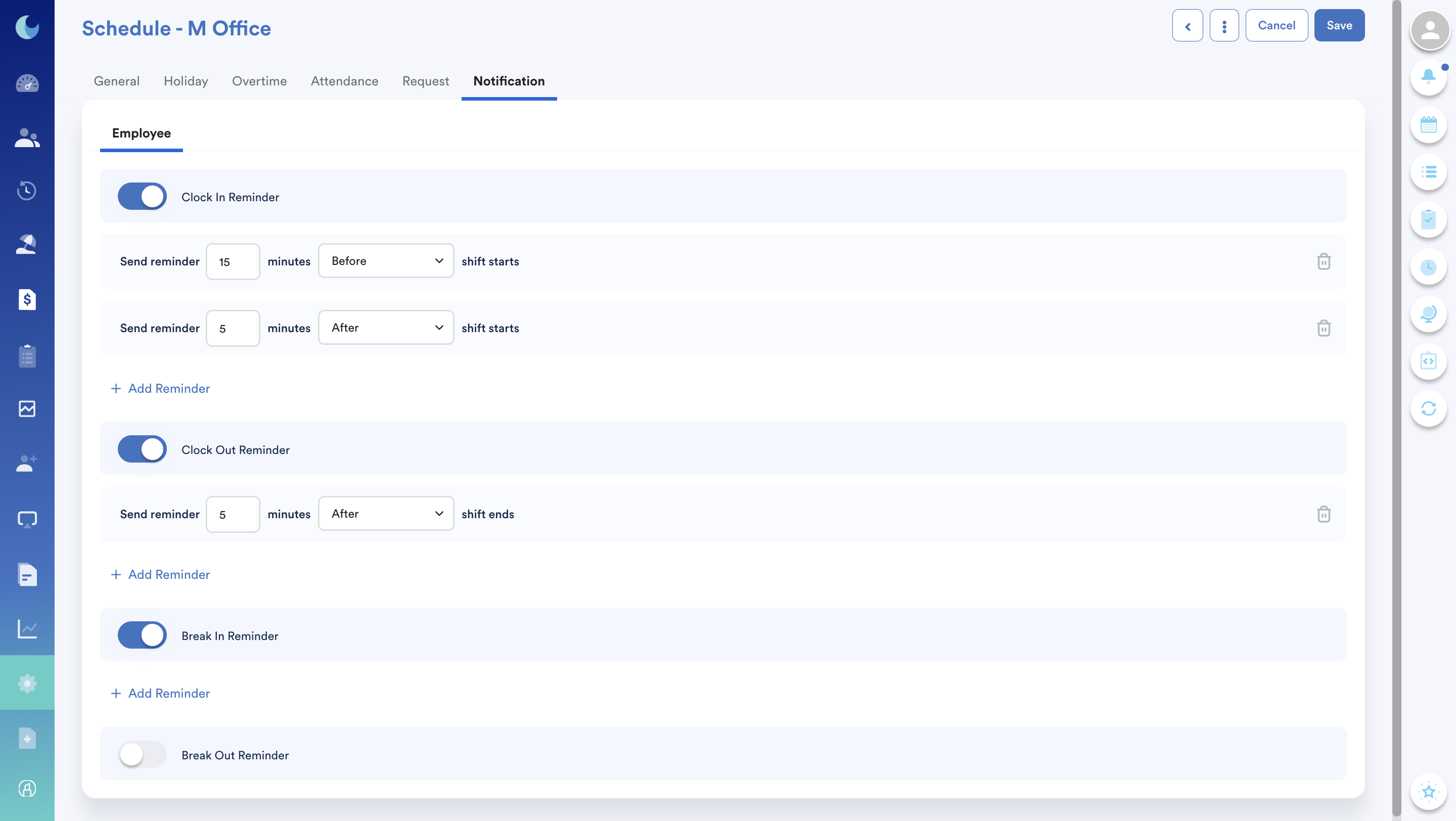 The reminder settings here apply to all employees under the same schedule. If you need different settings for different groups, create a separate schedule based on your requirements.