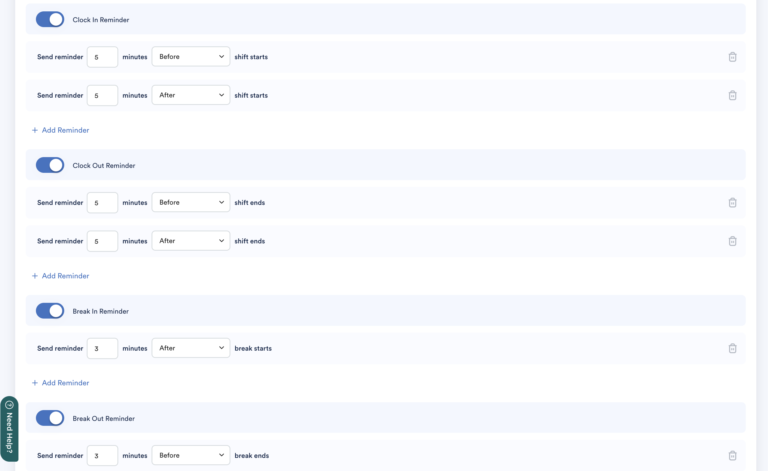- Normal Shift: Reminders are sent based on shift start and shift end.