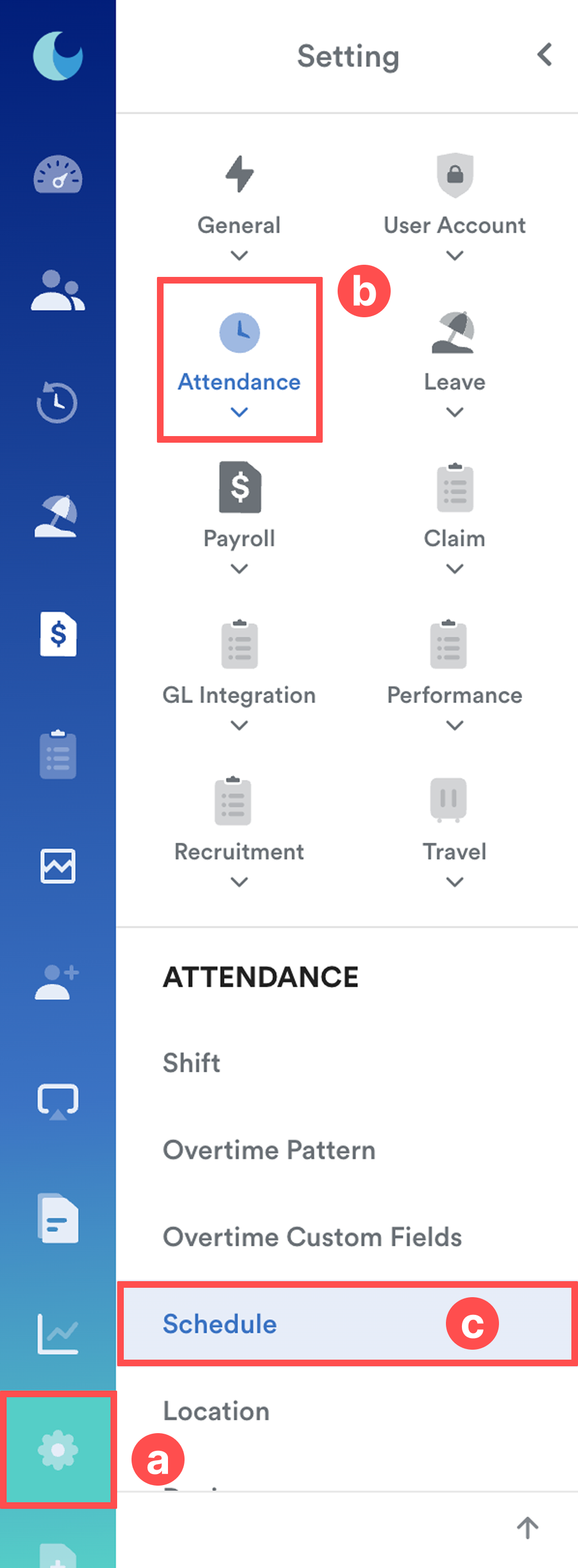 On the left menu, go to Settings (a) > Attendance (b) > Schedule (c). Select the relevant schedule.