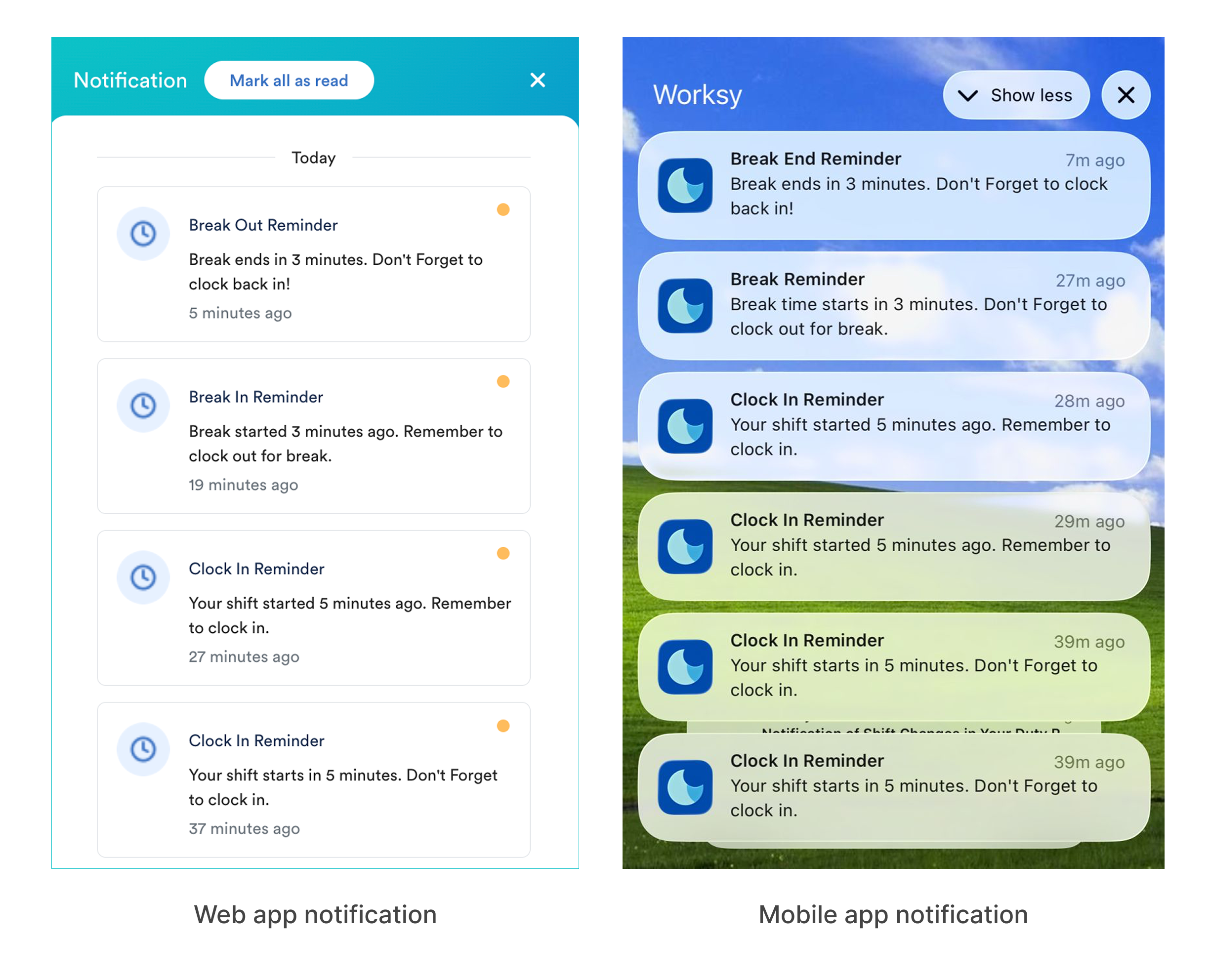 To help employees perform clocking accurately, reminders are sent as push notifications on the employee’s device and in-app notifications via the Worksy web app.