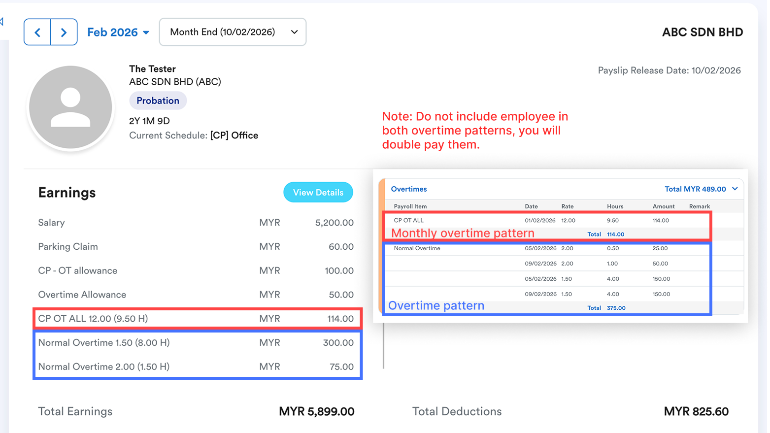 Please don't include the same employee in both the overtime pattern and the monthly overtime pattern, as this will result in double OT pay for that employee.