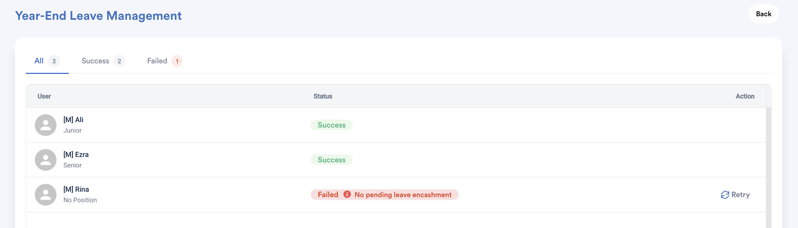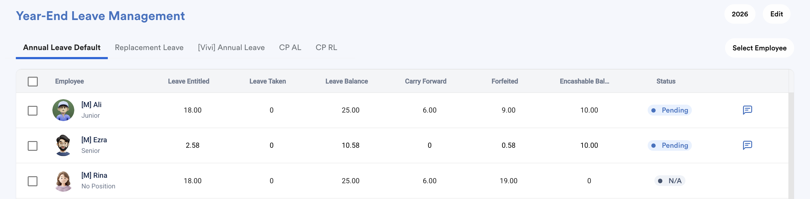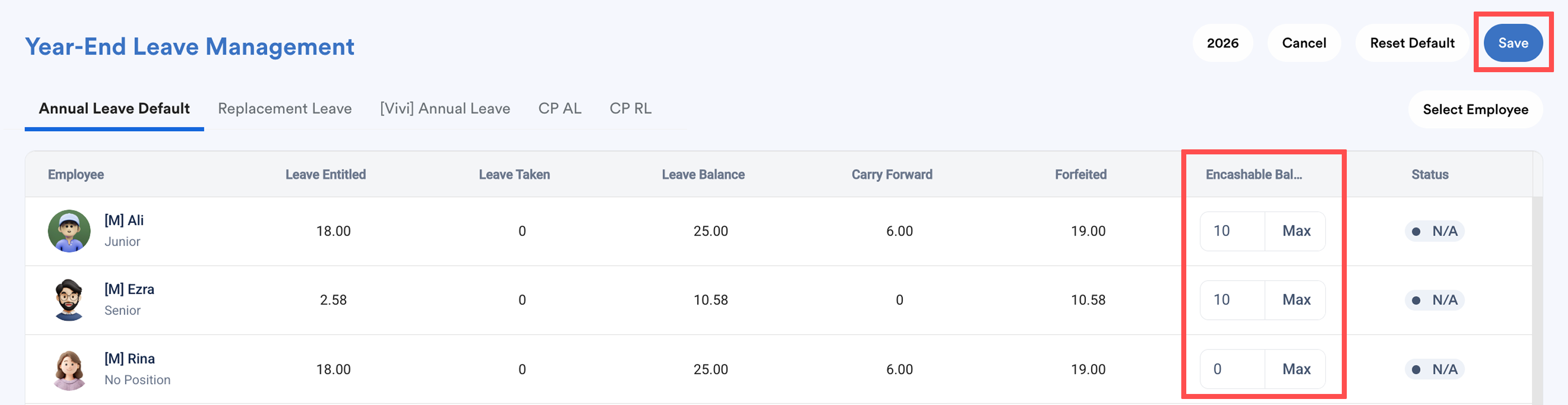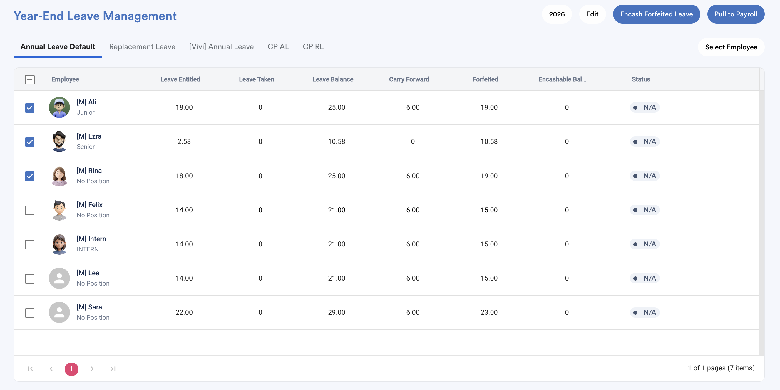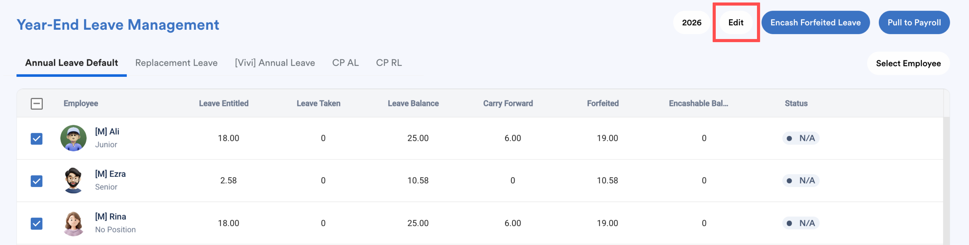 The employees’ Encashable Balance will be updated in bulk based on their forfeited amount, and the forfeited balance will be deducted accordingly.