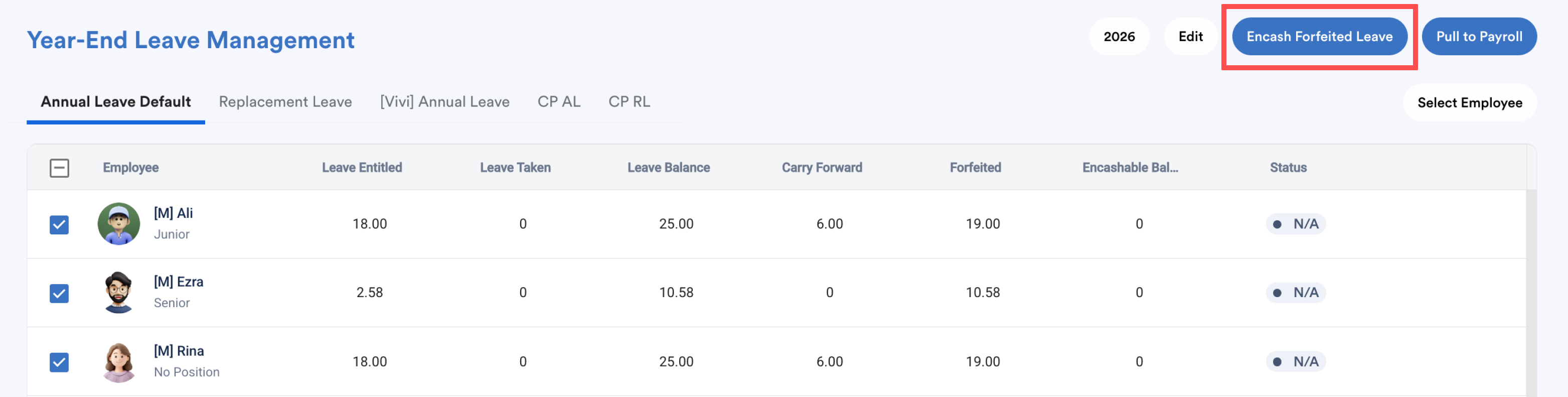 Click Encash Forfeited Leave as a batch action to convert all forfeited leave into encashable balance.