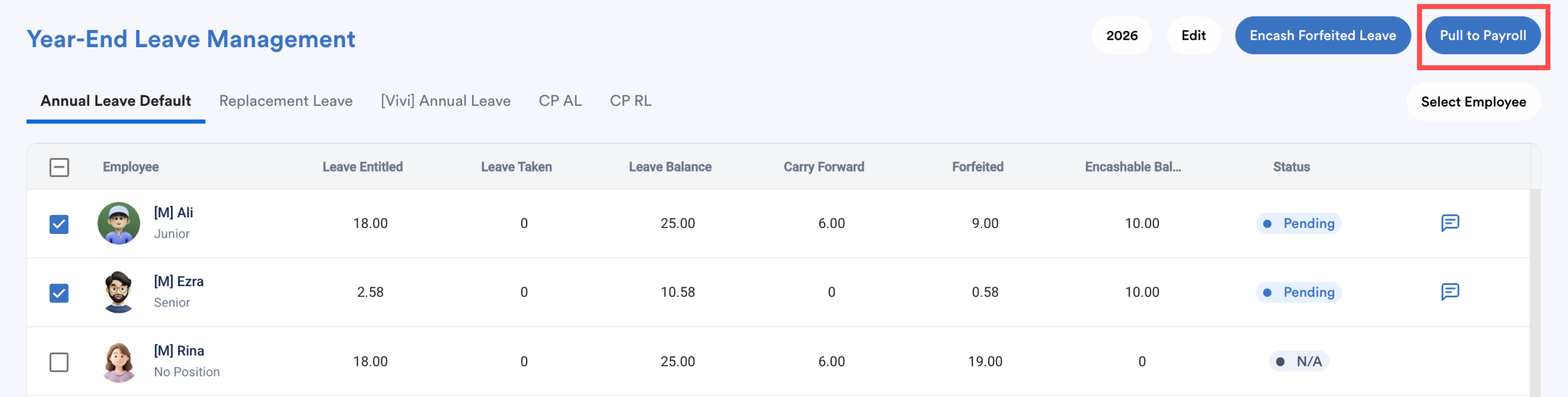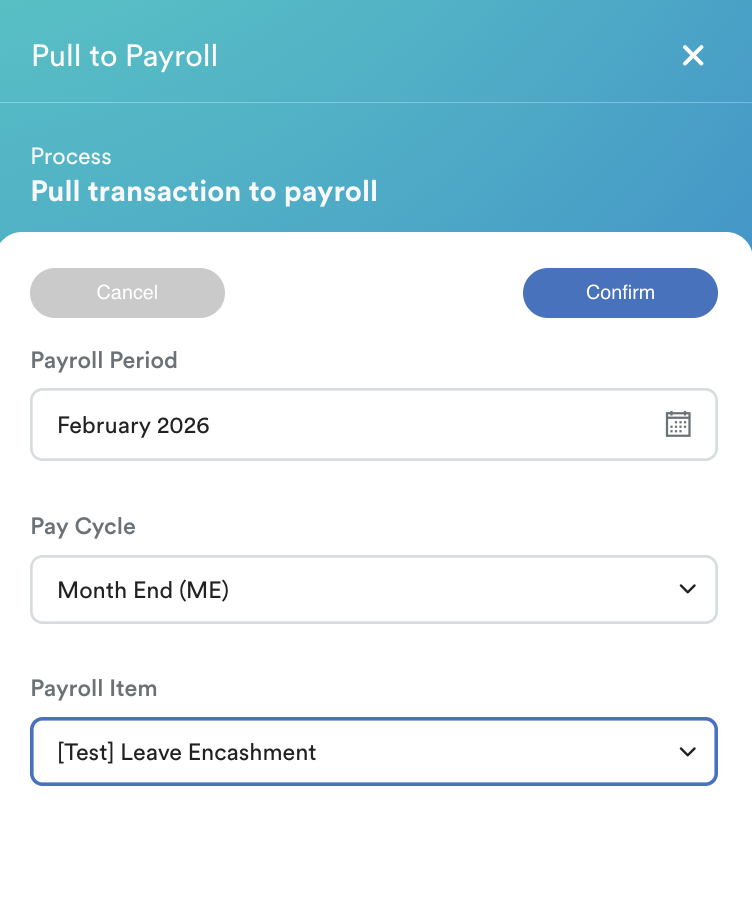 Once the encashable balance is confirmed and status has changed to Pending, you may proceed to push it into payroll.