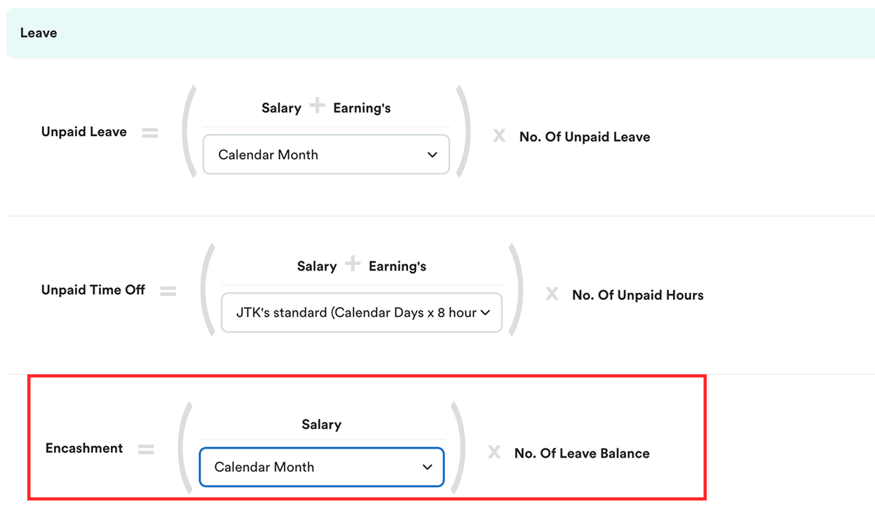Leave encashment calculation is based on the payroll policy setting > Leave section.