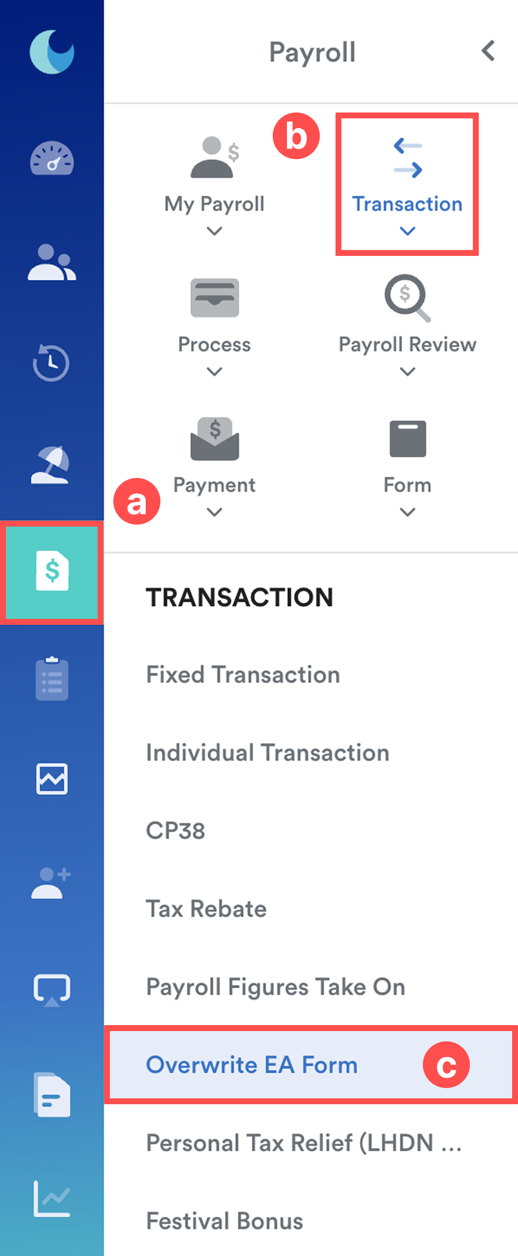 On the left menu, go to Payroll (a) > Transaction (b) > Overwrite EA Form (c).