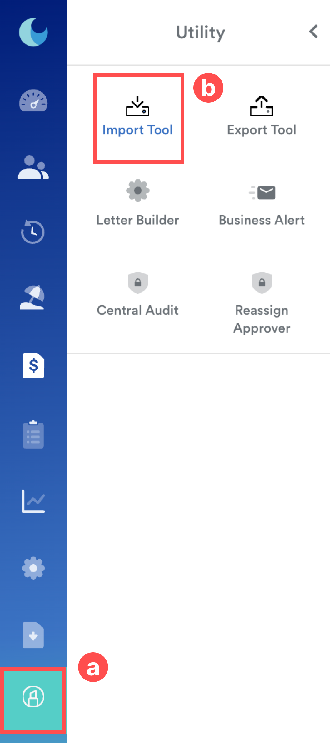 On the left menu, go to Utility (a) > Import Tool (b).