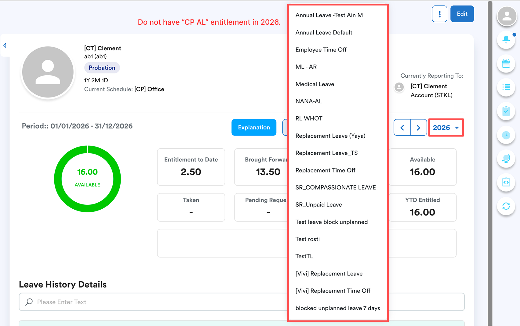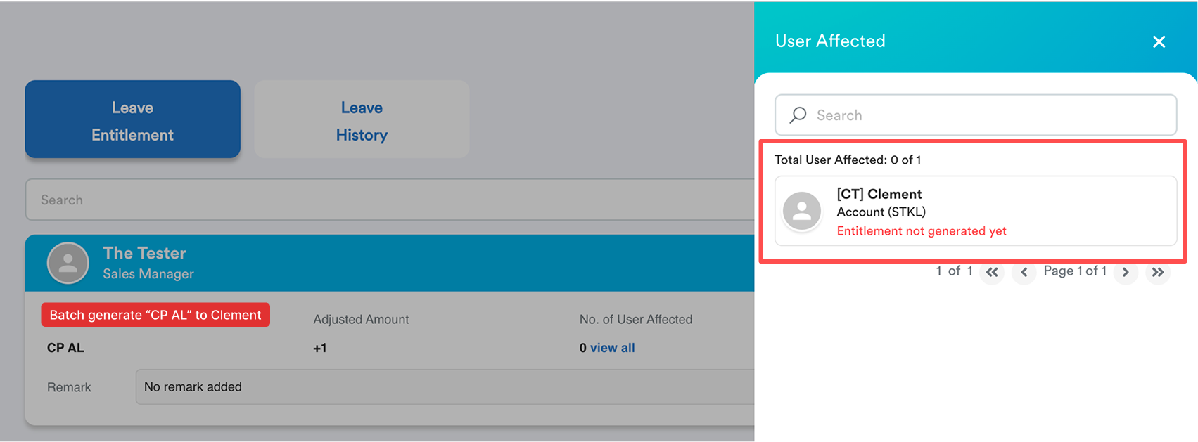 The Tester did a batch leave for leave type called "CP AL" for employee Clement in 2026. "Entitlement not generated yet" error is shown.