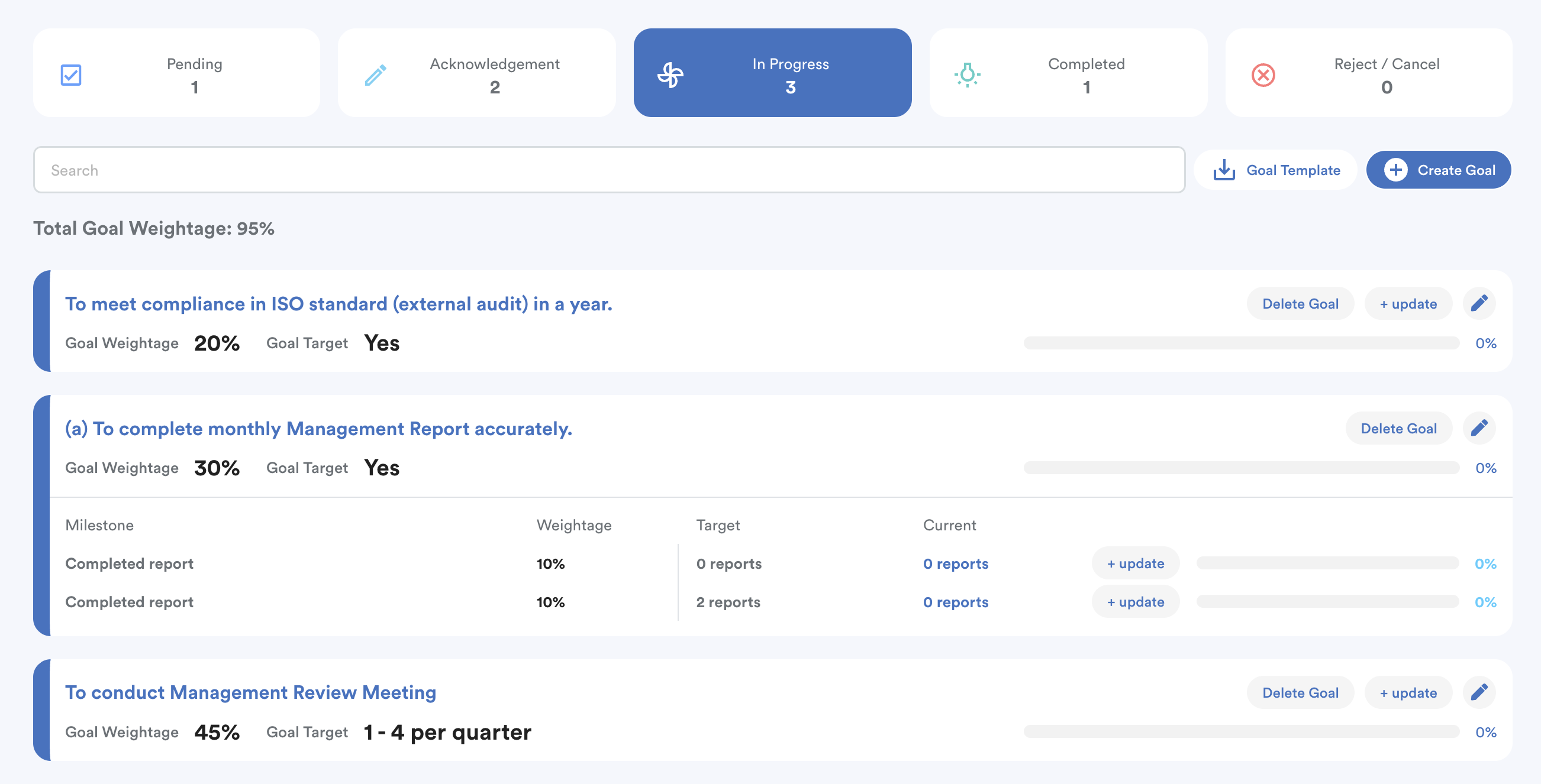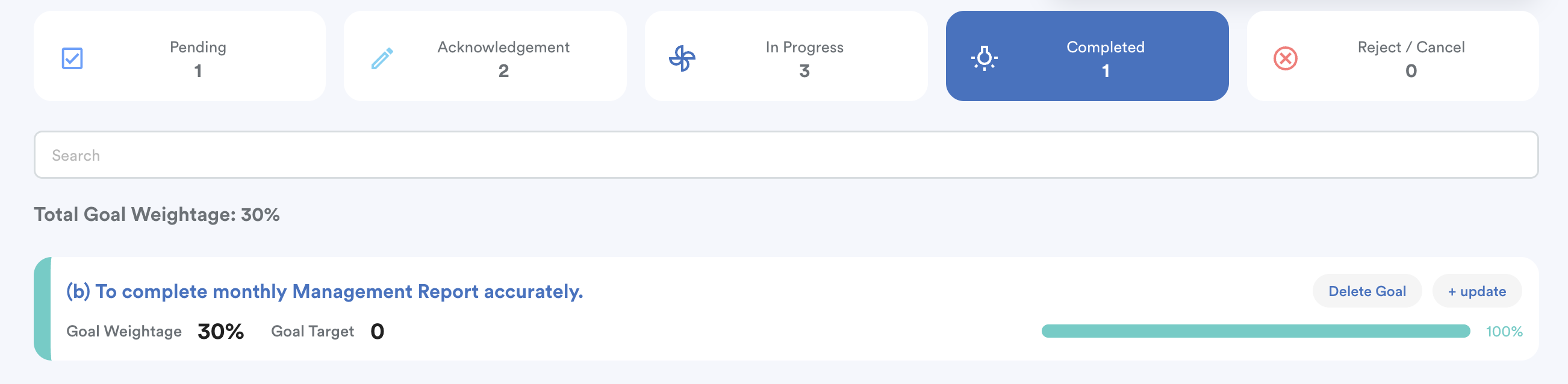 - Goals automatically move here once the appraisee updates their progress and reaches the defined target.
