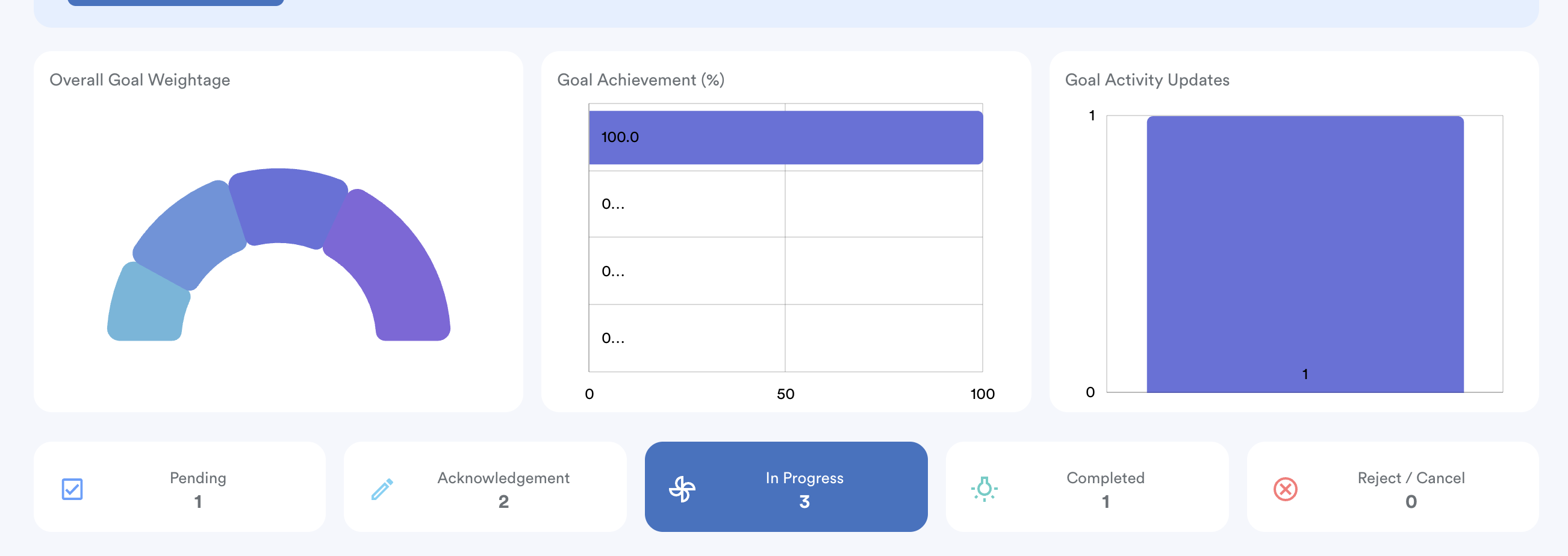 - This tab includes charts for Overall Goal Weightage, Goal Achievement (%), and Goal Activity Updates.