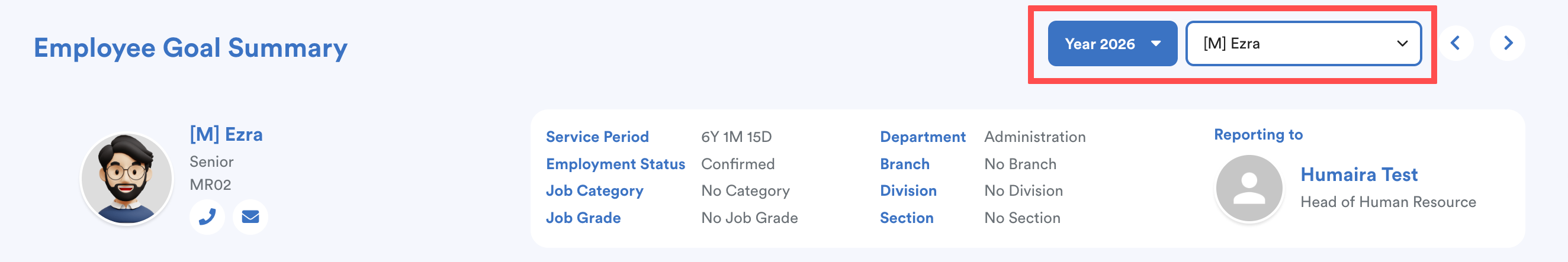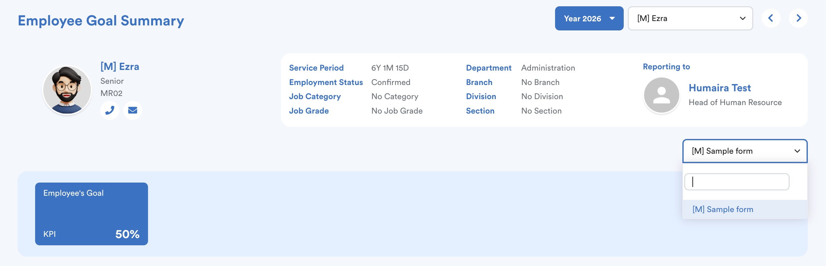 Select the relevant Appraisal Period (Year) and the Employee name. The system will display the employee’s basic employment information.