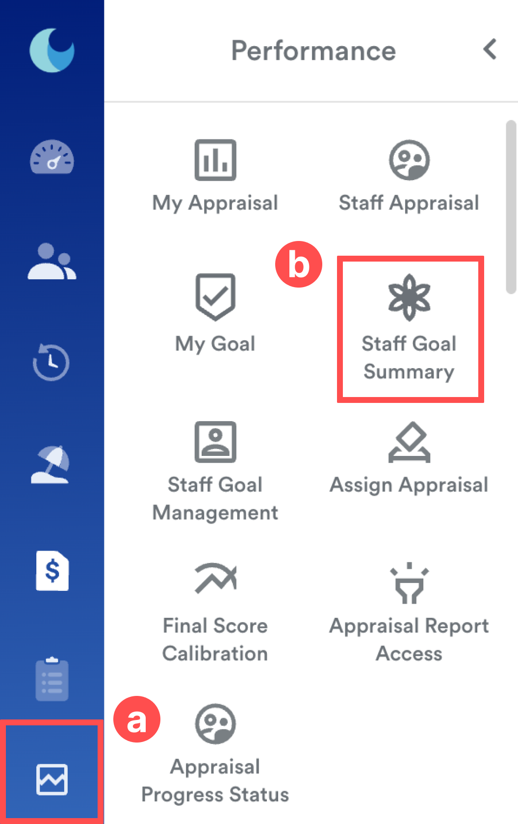 On the left menu, go to Performance (a) > Staff Goal Summary (b).