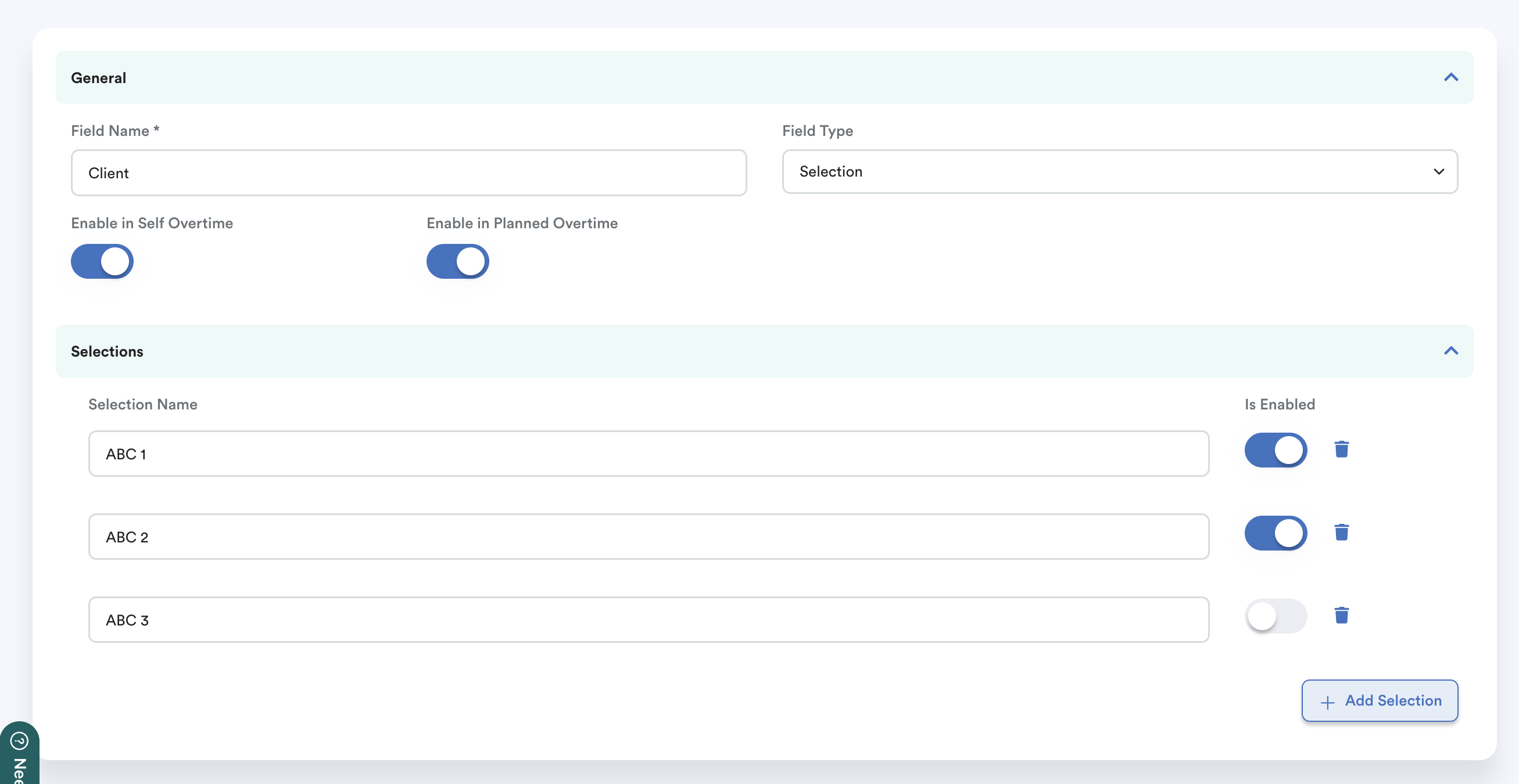 If Selection type is chosen, you can Add Selections list by clicking the button. You can show or hide each option from employees by toggling the Is Enabled button.
