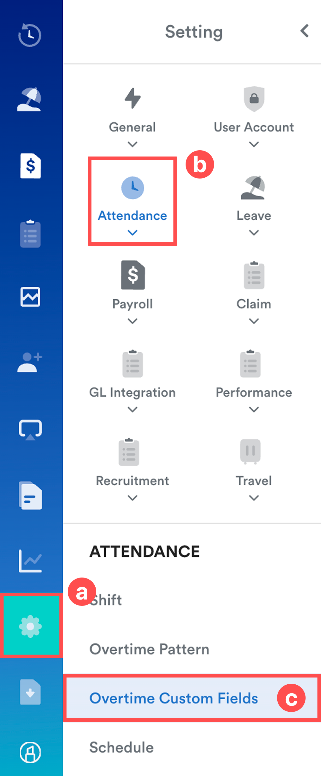 On the left menu, go to Settings (a) > Attendance (b) > Overtime Custom Fields (c).
