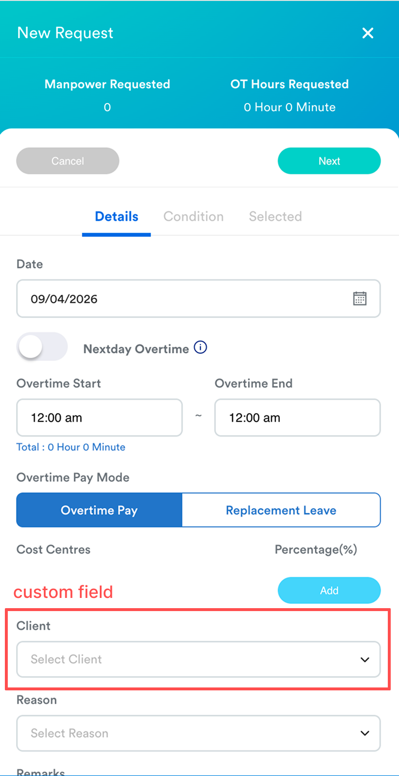 Once a custom field is created and enabled for Self-Overtime and Planned Overtime, employees will be able to see and select the configured options when submitting their requests.